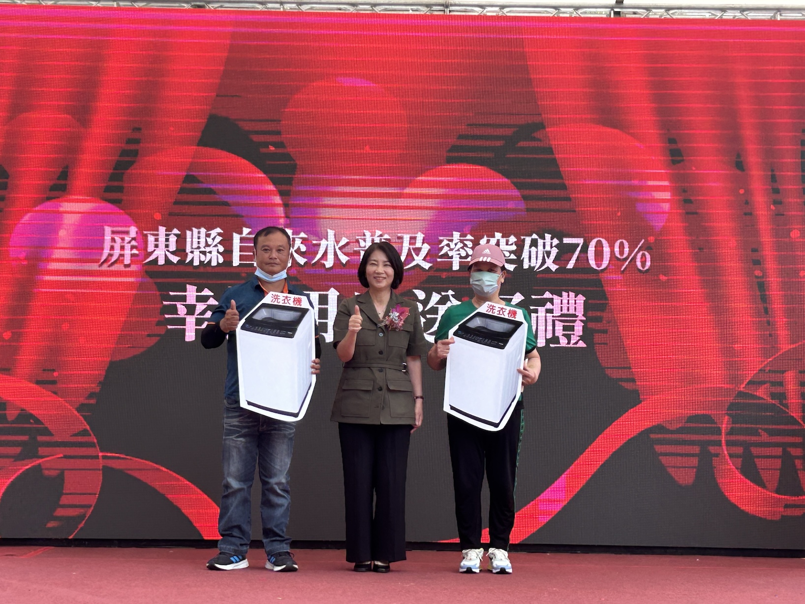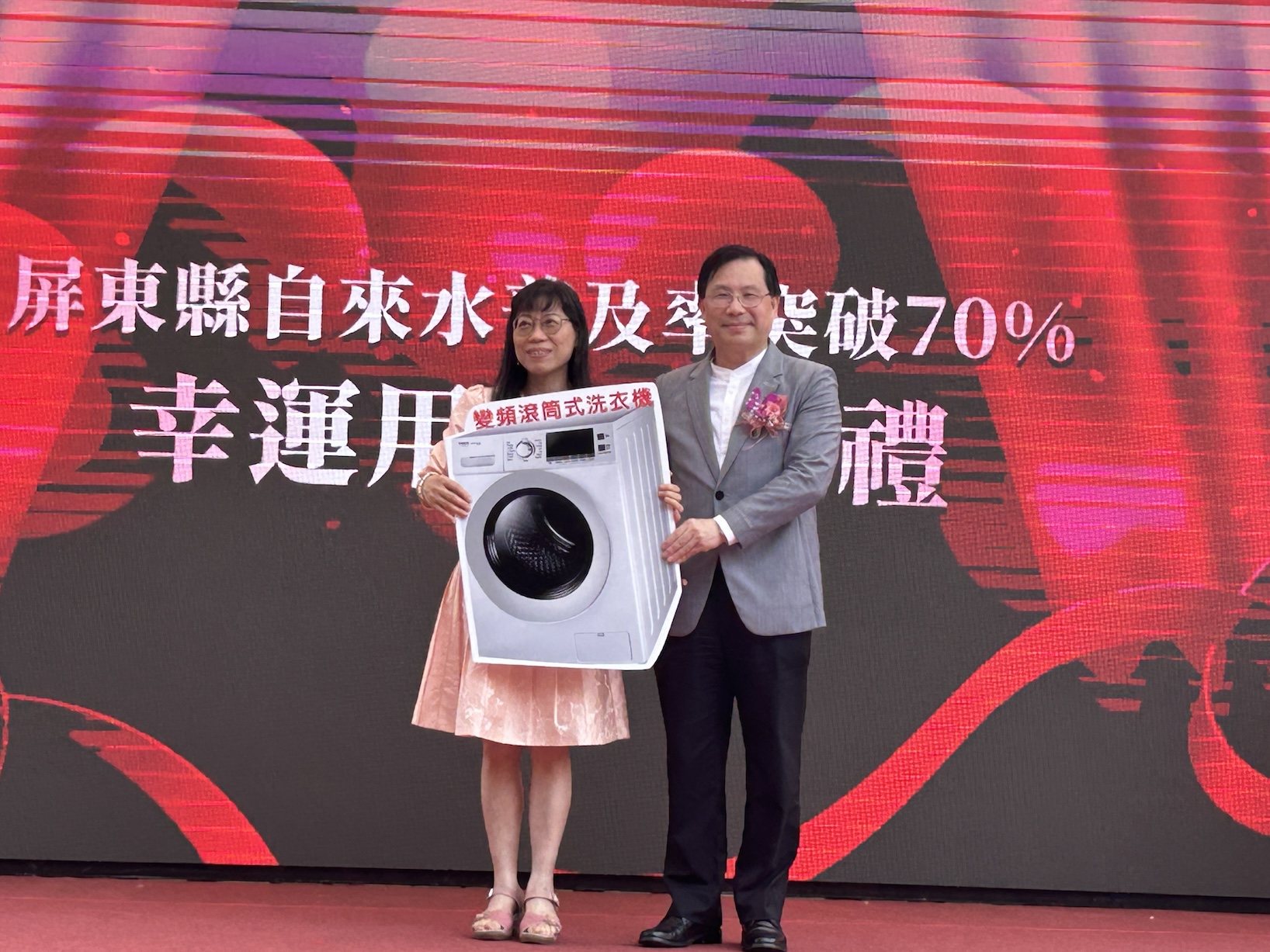 為了感謝屏東鄉親,水公司特別邀請達成普及率70%的幸運用戶,以及前5名、後5名用戶參與,送出實用的洗衣機及微波爐等家電,最大獎是滾筒式變頻省水洗衣機1台,由潮州陳小姐獲得。