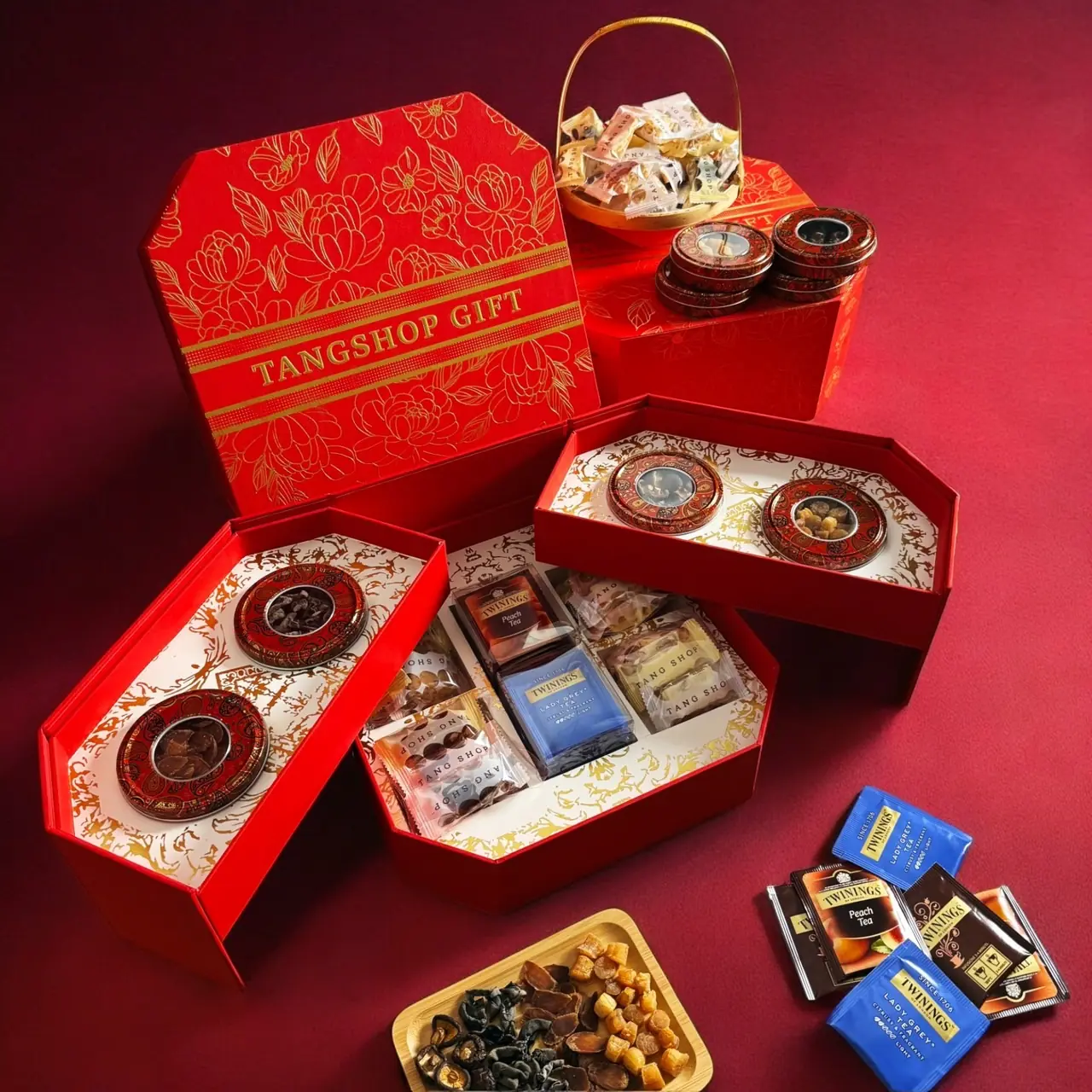 今年唐舖子過年推出兩款限定禮盒,一款為寓意財富滾滾來的財富禮盒,內容物有四款唐舖子的經典牛軋糖與南棗核桃糕等,限量10000盒,另一款為針對長輩送禮的尊榮禮盒,不只有唐舖子經典牛軋糖,更有人參、干貝、香菇、川耳 四大乾貨,禮盒外觀也是相當豪華。