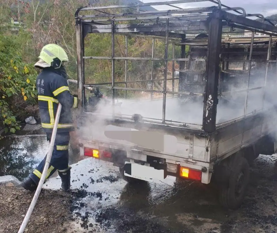 枋山分隊接獲派遣後迅速趕往,現場為一輛小貨車後斗堆放農用機具、易燃物及電池,所幸消防人員及時趕到,迅速控制火勢,未造成人員傷亡。