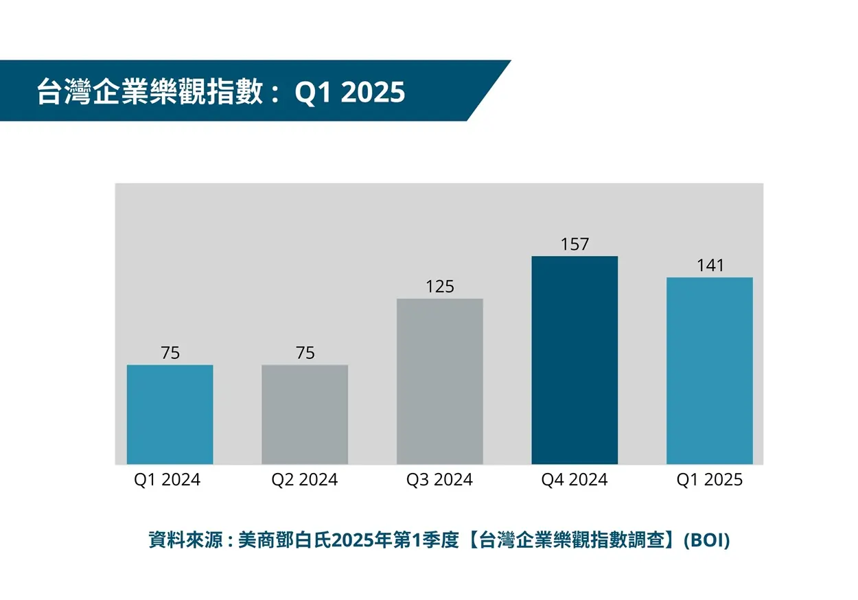 另2025年第一季台灣企業樂觀指數調查(BOI)主要發現:2025年第一季台灣企業樂觀指數為141,較上一季跌幅達10.4%。台灣企業對需求的謹慎態度,反應在新增訂單量和銷售價格的指數表現,分別下滑32%和27%。企業維持競爭力同時,也更謹慎評估市場風險,對國際市場看法的保留程度更甚於國內市場。服務業也比製造業更保守小心地看待本季的商業環境。另外,庫存水準策略變得非常保守,與前兩季的高水準形成鮮明對比。儘管整體指數表現不如前期,但對新雇用員工的預期卻是自2020年第三季以來的最高水準。