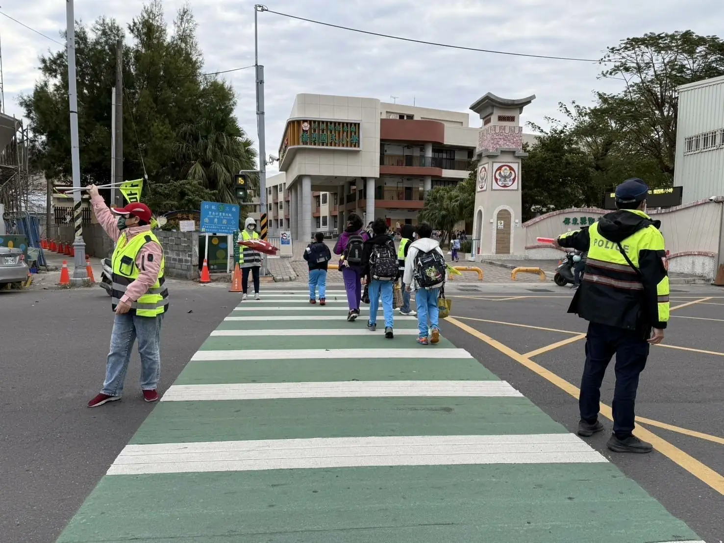圖:員警及義交於校門口與學校周邊重要路口指揮來往車輛,守護學童安全過馬路。(屏東縣政府警察局)
