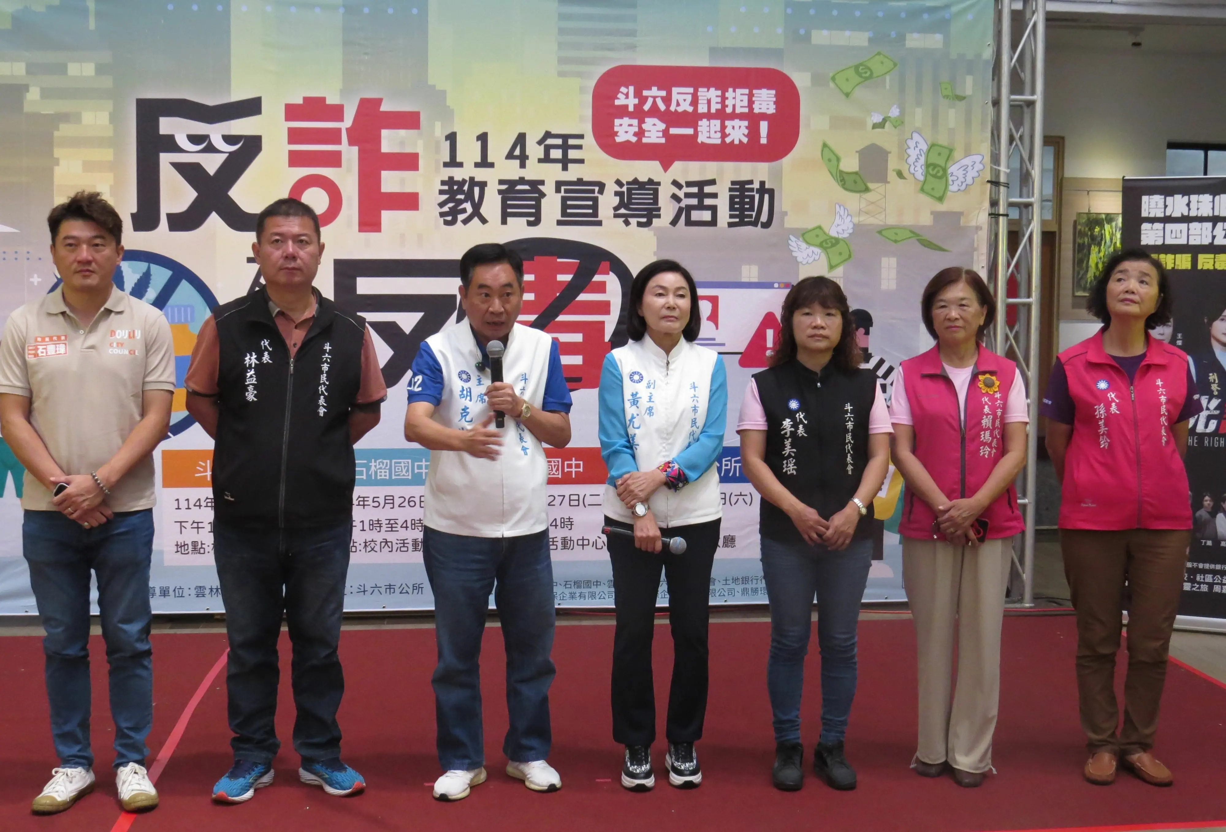 【記者黃金郎雲林報導】雲林縣斗六市公所為強化市民反詐拒毒意識,特別與「曉水珠心靈之旅」攜手合作,在轄內三所國中及斗六廳辦理四場反詐及反毒教育宣導活動,並由資深藝人周嘉麗號召知名藝人參與;市長林聖爵、市代會主席胡克勤、副主席黃尤美等人,今(十六)日上午在宣傳記者會邀請各界踴躍出席。
