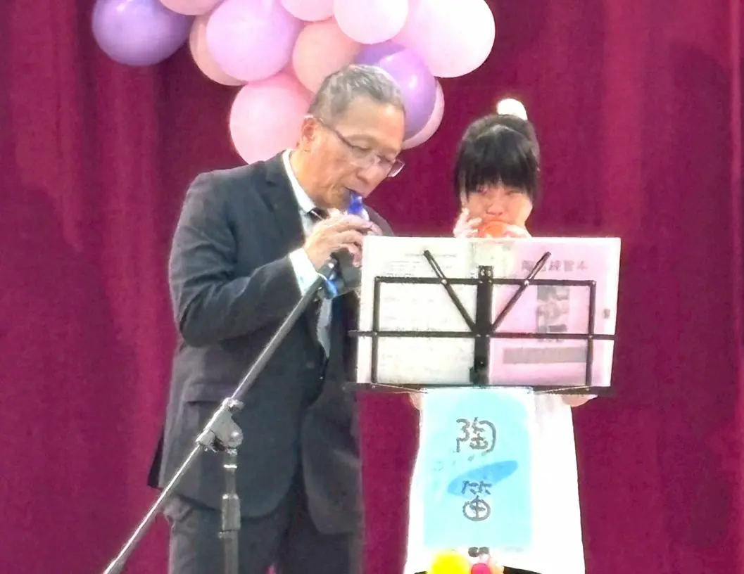 活動由校長王志全(左)、家長會長孔瑞琪主持,縣府教育處督學林玫慧、南投市長張嘉哲、、前會長陳純甚、簡議員、沈議員…等近百位貴賓,賀客盈門。多才多藝的王志全校長,尤以精湛的陶笛,親自指導小朋友有成,在這場畢典,王校長特與小朋友,以陶笛「望春風、萍聚」,奏出二首名曲表演,作為開場,熱鬧非常。