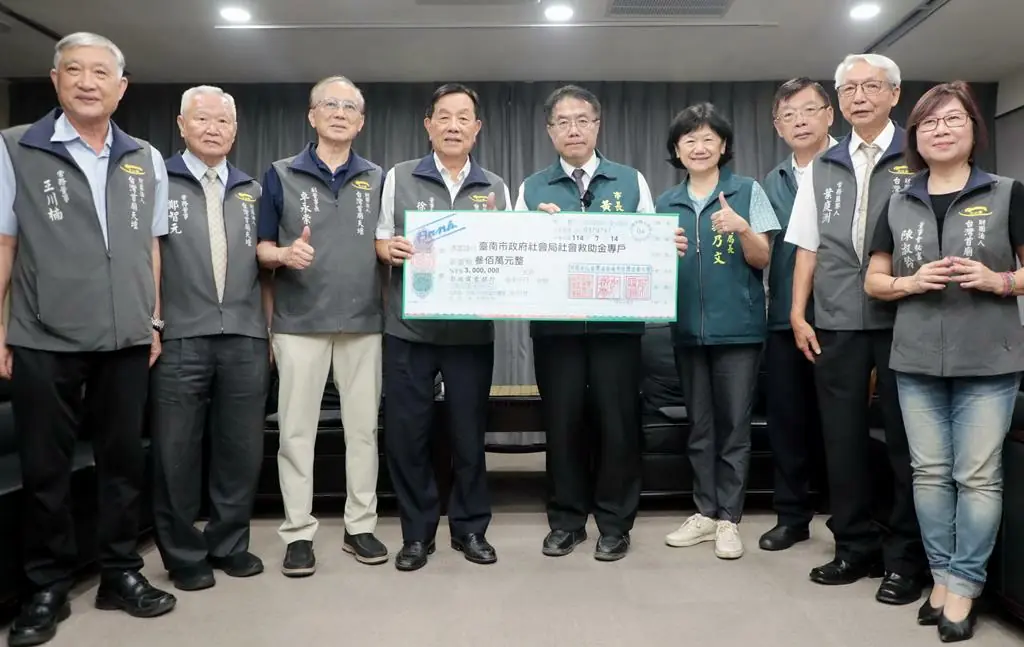【記者黃潔台南報導】丹娜絲颱風重創臺南溪北地區,嚴重影響民生與經濟;為協助災後重建、支持災民度過難關,財團法人台灣省台南市台灣首廟天壇14日捐贈300萬元協助受災家庭重建與生活救助;市長黃偉哲代表接受並回贈感謝狀,民政局長姜淋煌、社會局長郭乃文也出席,向首廟天壇董事長徐國潤、副董事長及常務董監事表達謝意。