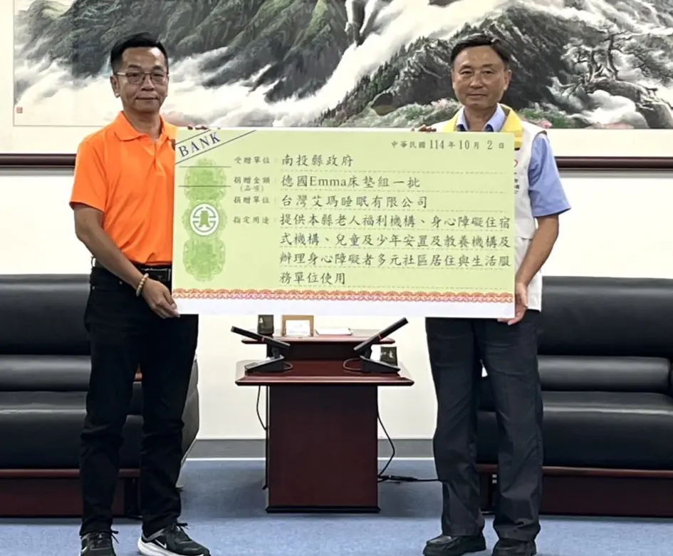 【記者陳美杏南投報導】為協助南投縣弱勢民眾,提升照顧服務品質,台灣艾瑪睡眠有限公司捐贈德國Emma床墊組一批,(2)日在縣長會客室舉行捐贈儀式,由社勞局長林志忠代表接受,將提供縣內身心障礙住宿式機構、老人福利機構、兒童及少年安置及教養機構及多元社區居住與生活服務方案單位運用。