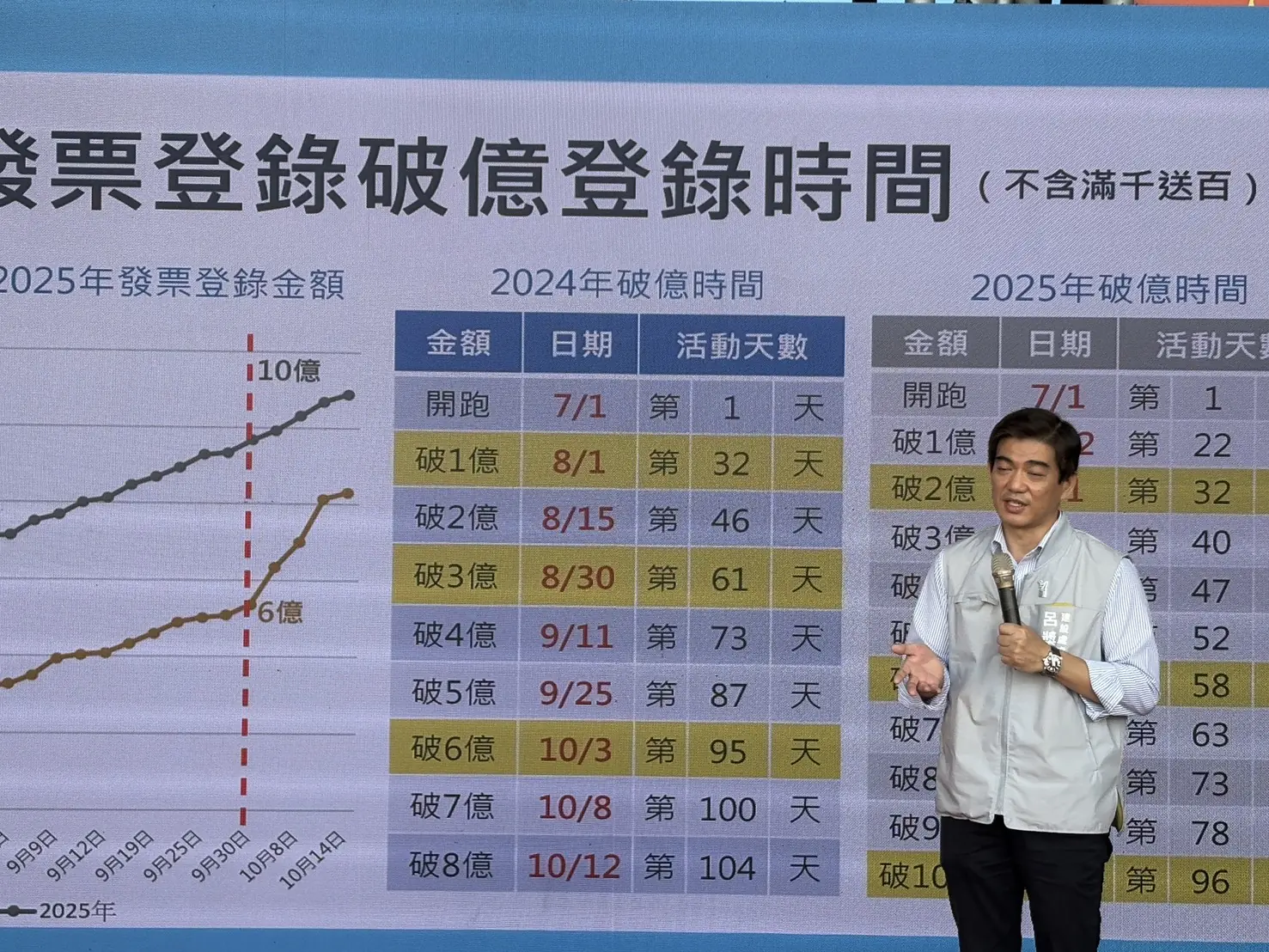 【記者張文一嘉義報導】2025嘉義市購物節自7月1日熱烈開跑,於10月12日截止,本屆活動發票登錄總金額高達10.9億元,如果加入嘉義市民專屬滿千送百發票登錄總額更高達13.54億元,其中「嘉購王」的個人消費金額達3,911萬元,雲端發票登錄總額更衝上2.9億元,黃敏惠市長(31)日頒發佰萬汽車、佰萬現金、名牌包、光陽電動機車、以及電子支付獎「iPhone 17手機+AirPods耳機」等大獎。黃敏惠市長感謝旅館、店家夥伴以及市民朋友,讓嘉義市購物節成功掀起一股消費熱潮,活絡嘉義市買氣與觀光人潮,展現嘉義市驚人的消費力!