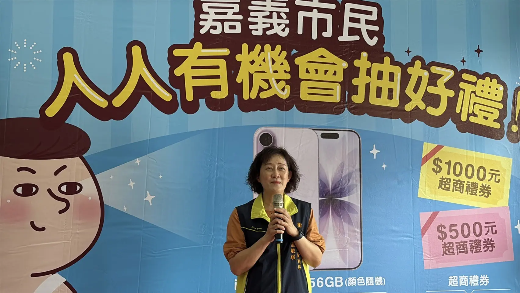 嘉義市衛生局廖育瑋局長說明,設籍嘉義市市民於114年10月1日至114年12月31日期間,在本市醫療院所(含學校及社區接種站)接種公(自)費流感疫苗及新冠疫苗者最多可獲得2次抽獎機會。完成公(自)費流感疫苗接種者,可獲得500元超商禮券1次抽獎機會,共100個名額;若在活動期間,完成公(自)費流感及新冠疫苗接種者,可再獲得1次抽獎機會,頭獎為iPhone 17手機共5名(顏色隨機),未獲頭獎的民眾可再抽1,000元超商禮券共100名。
