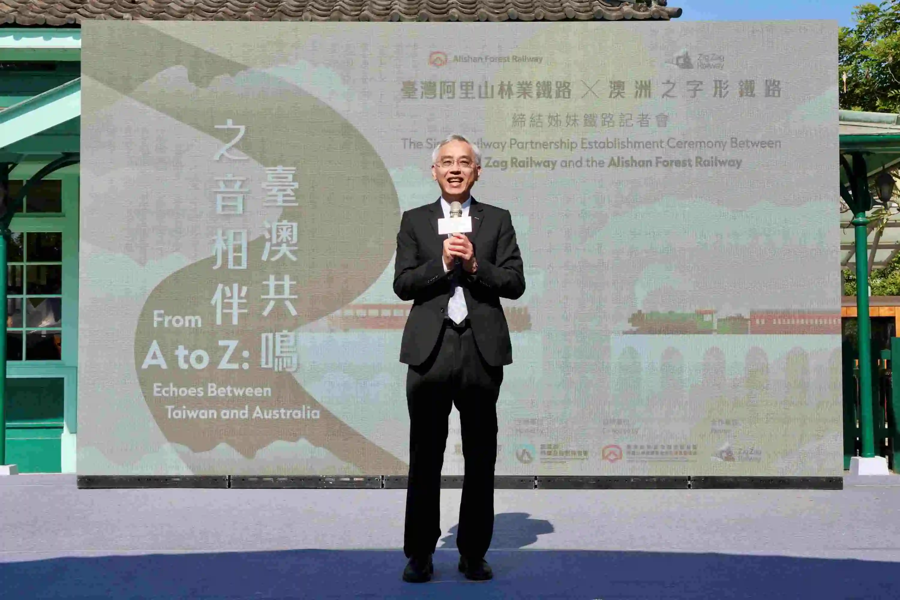 阿里山林業鐵路及文化資產管理處王昭堡處長,熱情歡迎跨洋來臺之字形鐵路與阿里山林鐵締結姊妹鐵路,他提及今年10月派出兩位同仁前往澳洲交流,之字形鐵路團隊不僅熱情接待,更毫無保留地分享駕駛與維修經驗,是趟收穫豐富、受益匪淺的學習之旅,也為雙方未來的合作奠定了更堅實的基礎,期盼象徵友誼的列車能從北門驛車站啟動,讓兩鐵路未來合作走的更遠。