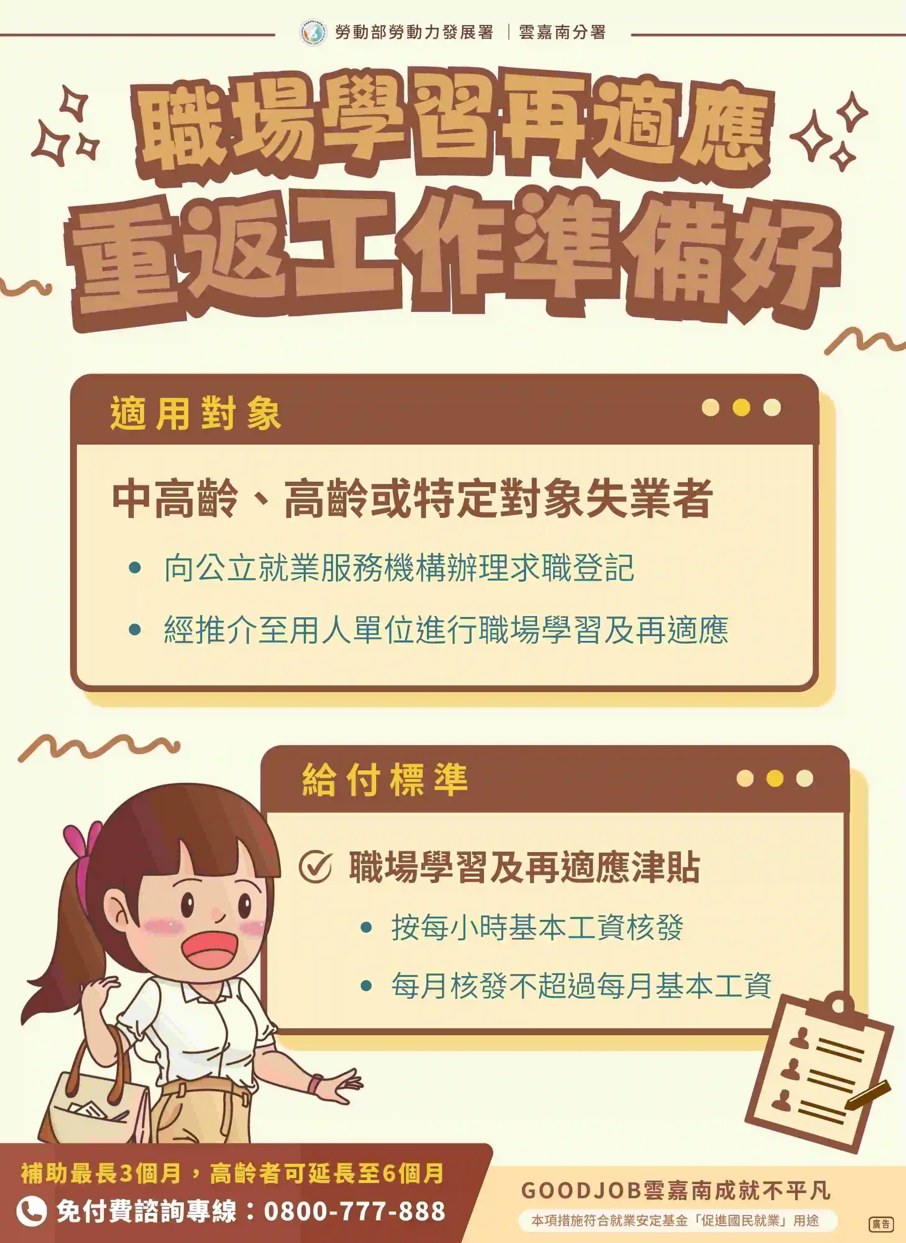 雲嘉南分署長劉邦棟指出,勞動部為鼓勵雇主聘僱特定對象提出多項就業促進措施,包含「職場學習及再適應計畫」及「僱用獎助措施」等資源,前者是補助雇主3個月的職場學習及再適應津貼及行管輔導費,減輕企業的用人負擔;後者則是雇主只要僱用公立就業服務機構所推介,失業滿30日以上特定身分勞工,將補助雇主每人每月9千至1萬5千元的獎助費用、最長發給12個月,計畫詳情都可向雲嘉南各就業中心洽詢。
