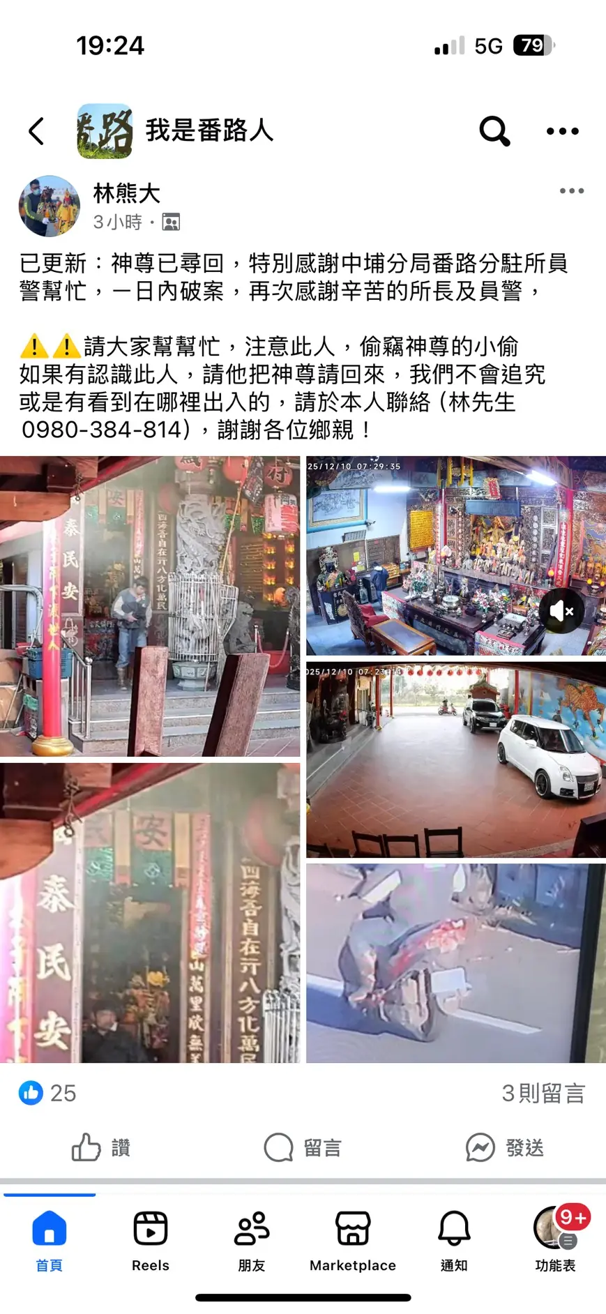 【記者張文一嘉義報導】有民眾於12月13日在社群網站po文,反映12月10日早上7時許,嘉義縣番路鄉下坑村某處宮廟神尊遭竊訊息,請求協尋,並表示只要送回不予追究。中埔分局番路聯合所獲悉後主動聯繫廟方,於現場清查後發現1座三太子元帥神尊遭人竊取。經調閱監視器鎖定嫌犯,兩小時後將竊嫌逮捕並尋回三太子;訊問偷竊原因,竟供稱用來擺設裝飾,而且有拜拜,讓偵辦員警哭笑不得。