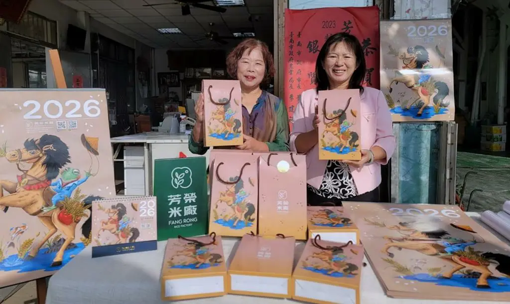 【記者黃潔台南報導】馬年將至,臺南後壁芳榮米廠特邀藝術家張百舜,以馬年生肖「奔馳好運、豐穗相隨」為主題,創作2026年「駿祥米禮盒」與「馬年奔馳年曆」封面,巧妙融入芳榮米廠吉祥物-象徵土地靈性與豐收預兆的「青蛙大哥」,同時以後壁稻田景致為主題印製精美月曆,期望成為承載祝福、陪伴人們迎向踏實豐收新一年的文化禮贈。