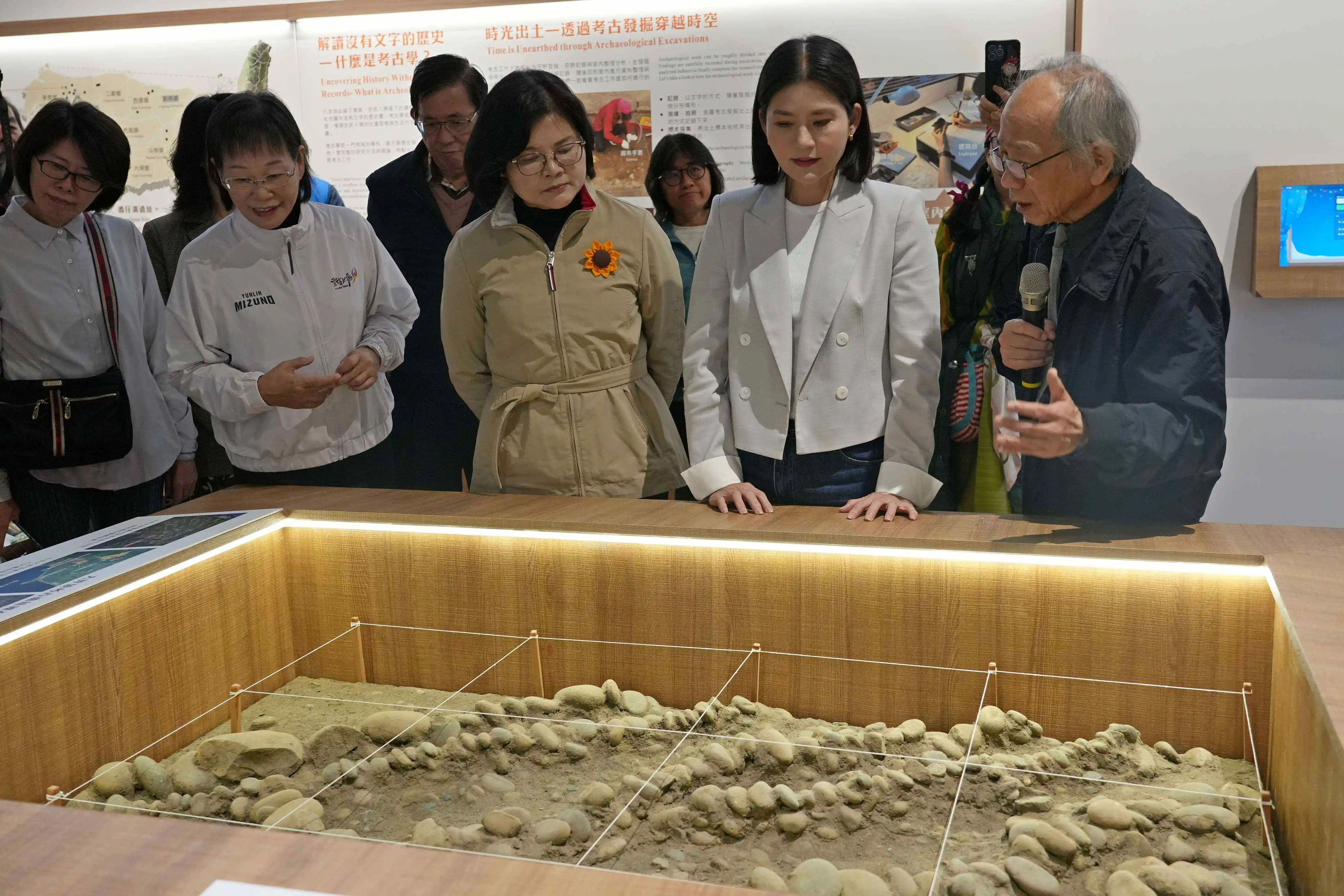 陳璧君進一步指出,展覽中包含多件極具研究價值的代表性文物,其中「喇叭型玉環」為全台僅見的珍稀類型,未來將朝國家重要古物方向持續研究;另有陶器上刻畫群舞人像,呈現史前部落群體休閒娛樂的生活樣貌,顯示史前人類社會已具備豐富文化內涵。館內也規劃教育導覽、考古體驗與手作課程,讓學童與民眾認識考古學方法、探勘流程與專業精神,深化文化扎根。
