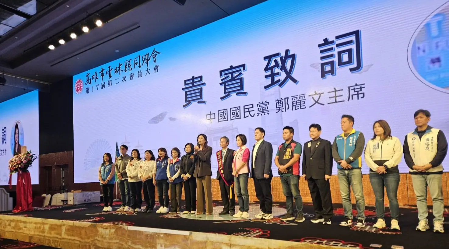 【記者陳雯萍高雄報導】藍營基層動能在港都集結,高雄市雲林縣同鄉會4日中午舉行第17屆第2次會員大會餐宴,席開70桌、場面熱絡,鄉親齊聚一堂,鄉情與政治熱度同步升溫。中國國民黨主席鄭麗文親自南下站台,與雲林縣長張麗善、立法委員柯志恩同場亮相,向在高雄打拚的雲林鄉親喊話,為2026選戰提前暖身。
