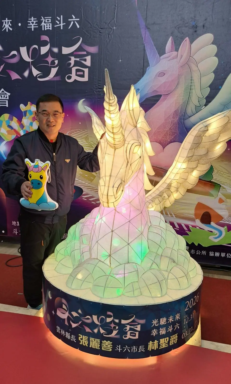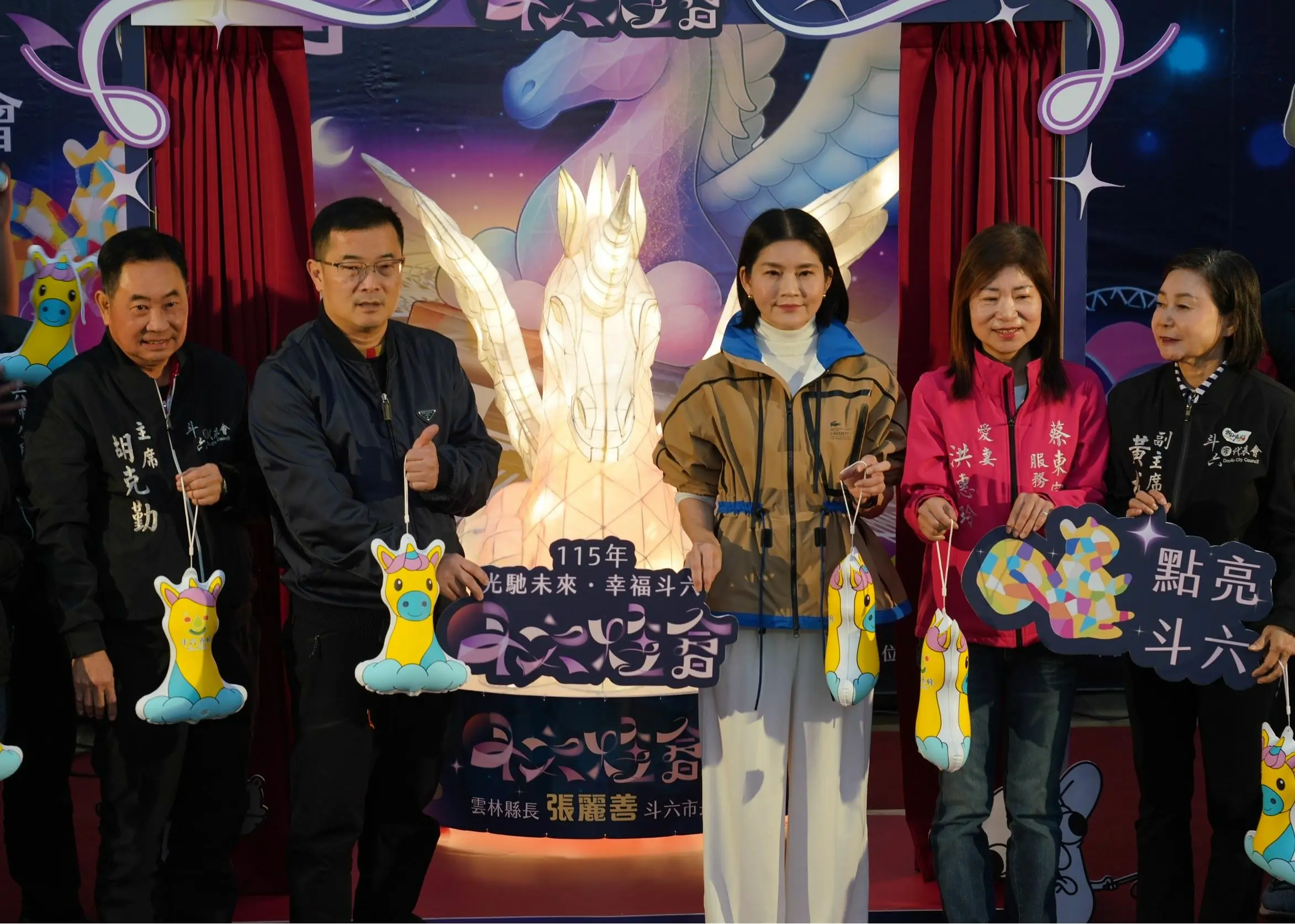 斗六市公所今天上午召開「斗六燈會」宣傳記者會,由副縣長陳璧君、市長林聖爵、市代會主席胡克勤、副主席黃尤美及多名代表、里長共同主持啟燈儀式,主燈以純白、乘風翱翔的獨角獸伴著雲朵展開繽紛彩翼,引領斗六邁向幸福與希望的城市願景,並規劃多組兼具文化創新與藝術美感的光影裝置,期透過燈光、造型與場域光環境設計交織,營造獨具特色的城市燈會景觀。