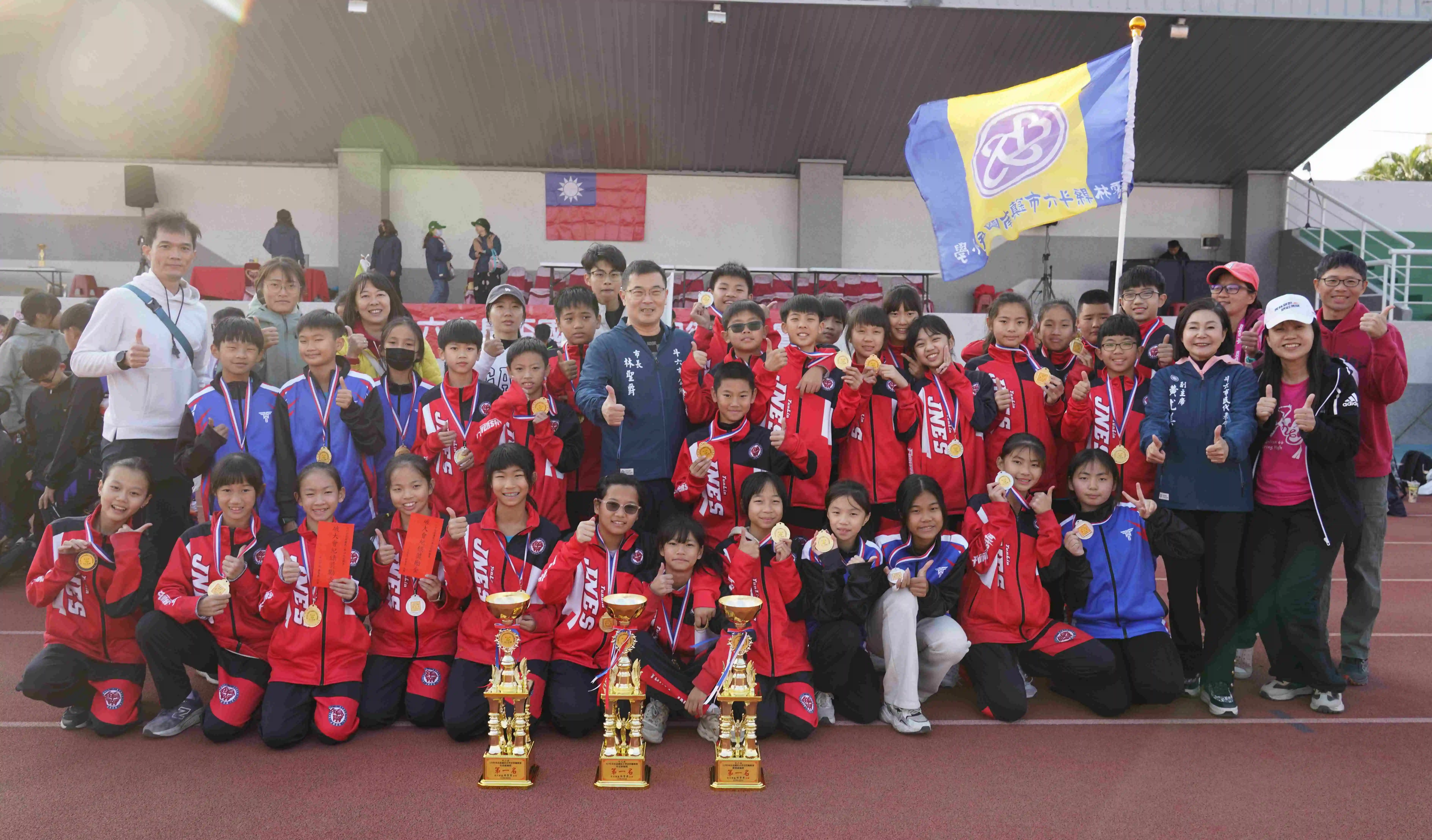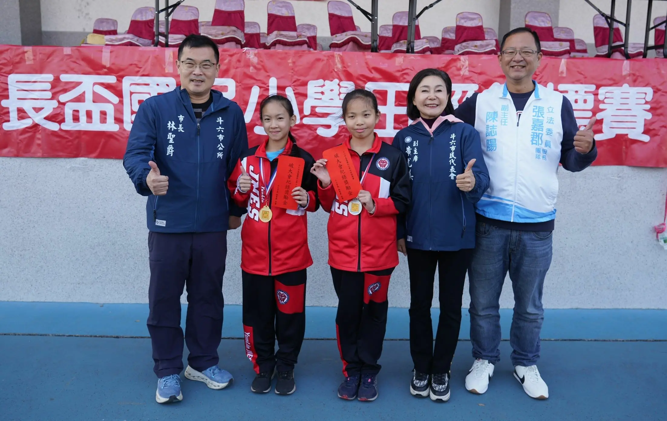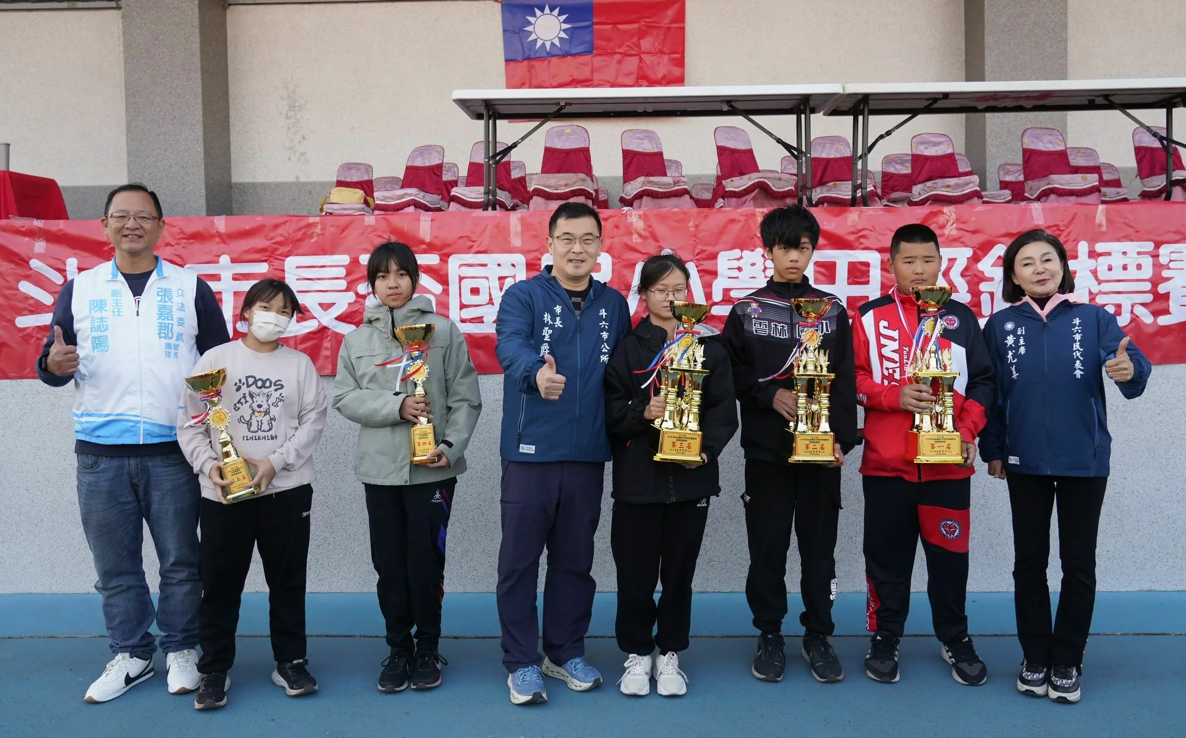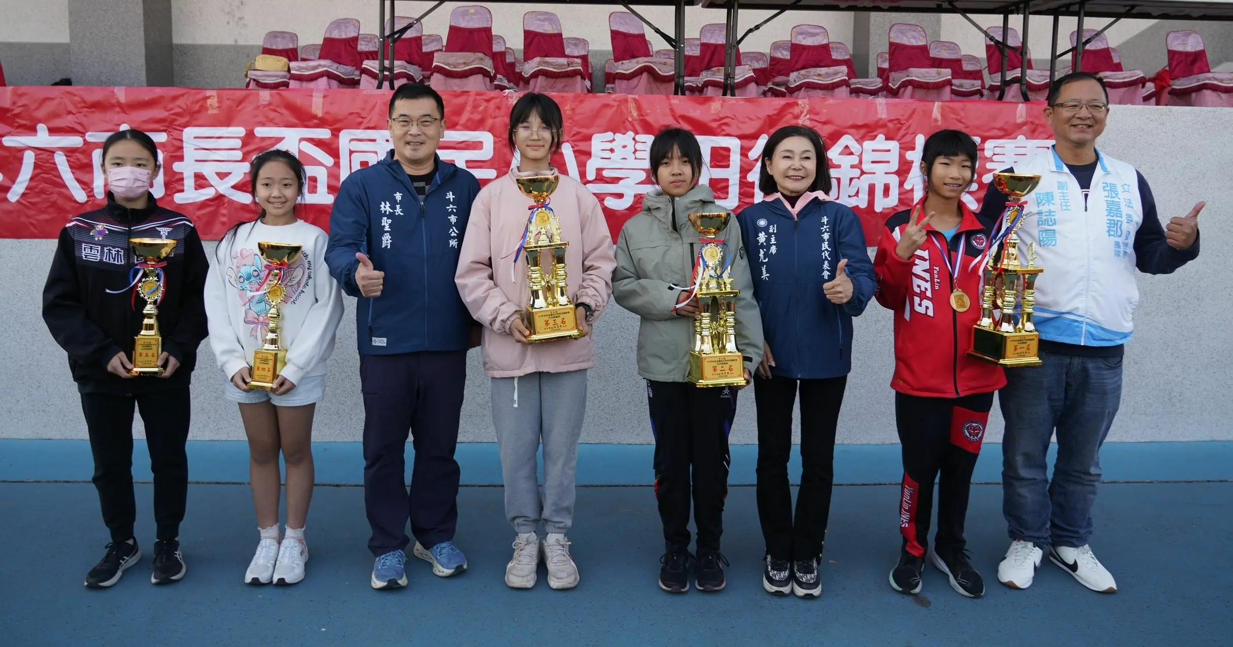 【記者黃金郎雲林報導】115年斗六市長盃國民小學田徑賽今(八)日登場,計有轄區13所國小近兩百名優秀運動員參賽,市長林聖爵率市公所團隊、市代會副主席黃尤美、里長及各校校長皆到場鼓勵選手勇於突破、再創佳績。