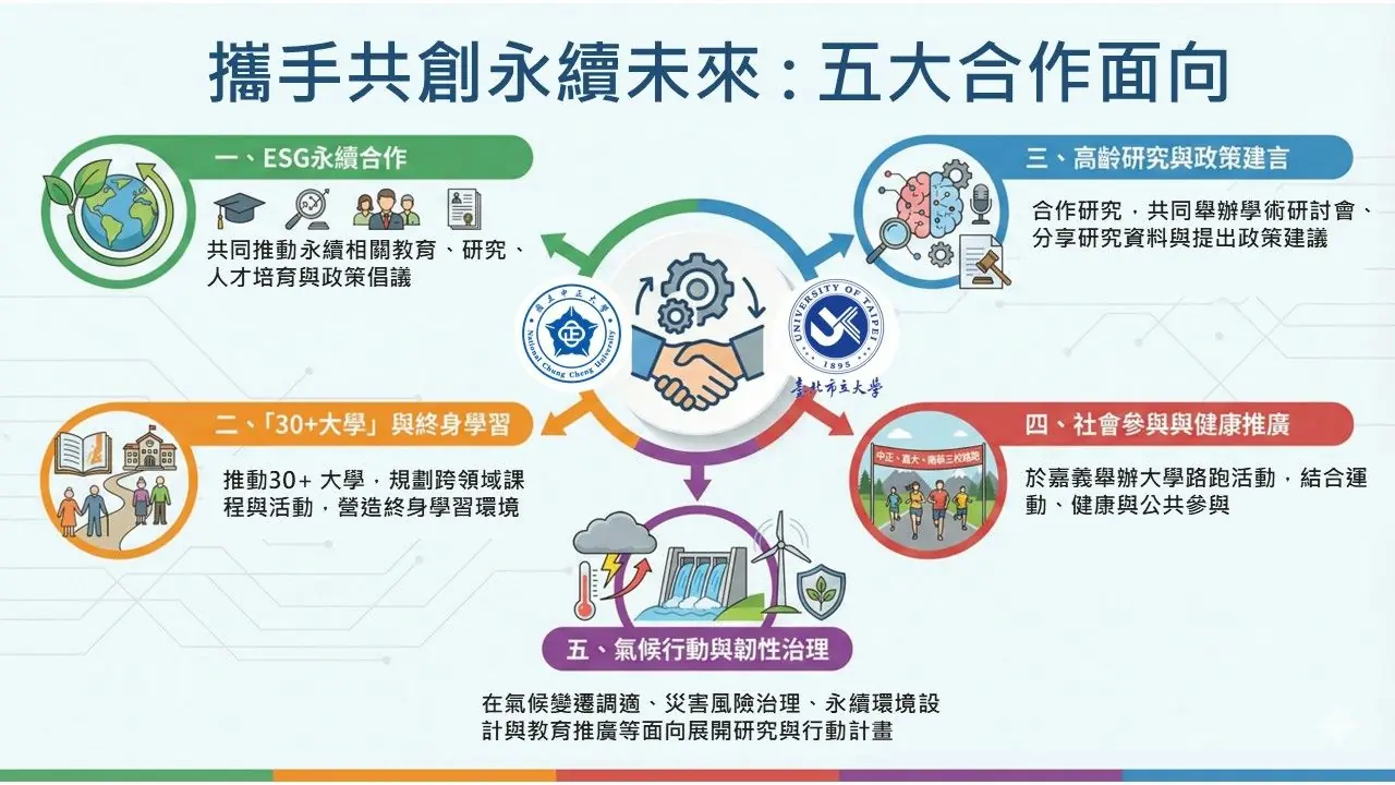 【記者張文一嘉義報導】為深化高等教育合作、共同回應高齡化社會與氣候變遷等重大議題,中正大學與臺北市立大學於15日正式簽署合作備忘錄,宣布將在永續發展、高齡研究、終身學習、健康促進及極端氣候行動等多元面向展開長期且多元的合作,為臺灣高等教育與社會發展注入新動能。兩校未來將聚焦ESG永續教育與政策倡議,並推動「30+大學」,深耕高齡與終身學習,打造全齡包容的學習與生活環境。