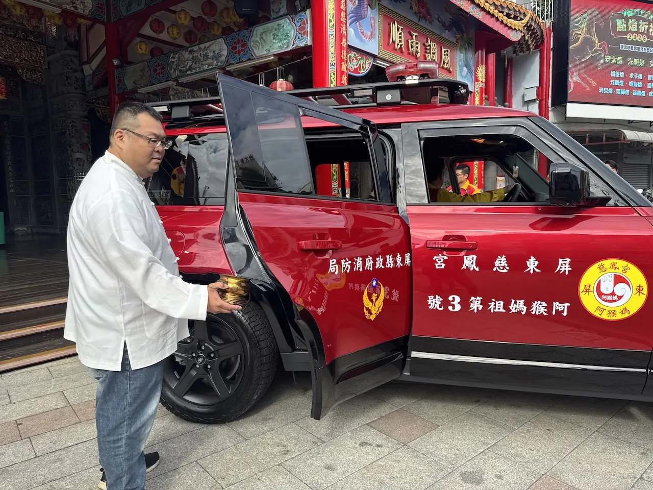 慈鳳宮人員為消防救災指揮車淨車。(記者梁秀瓊拍攝)