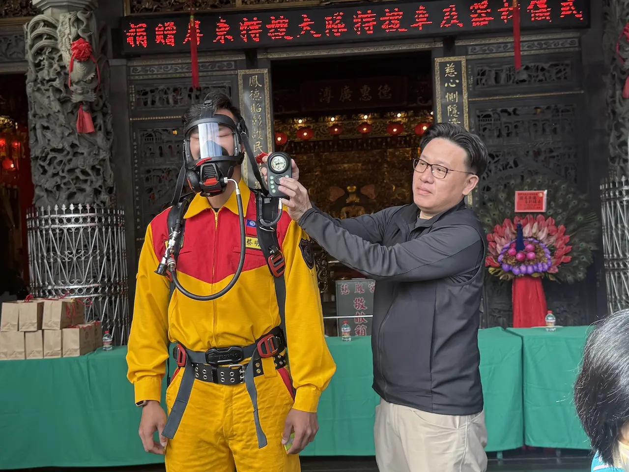 除「媽祖3號」,慈鳳宮還捐贈33組整合式PAC救命器。該設備結合電子安全輔助系統,用燈號顯示氣量,若氣瓶氣量即將耗盡即會亮紅燈,消防局長李彬正說明,消防人員進到火場,指揮官可透過平板監控同仁的殘壓氣量,如要撤退也可以透過藍芽發出警報聲,或是有溫度變化時也會警示,將可大幅提升消防人員在火場及高風險環境中的安全防護。