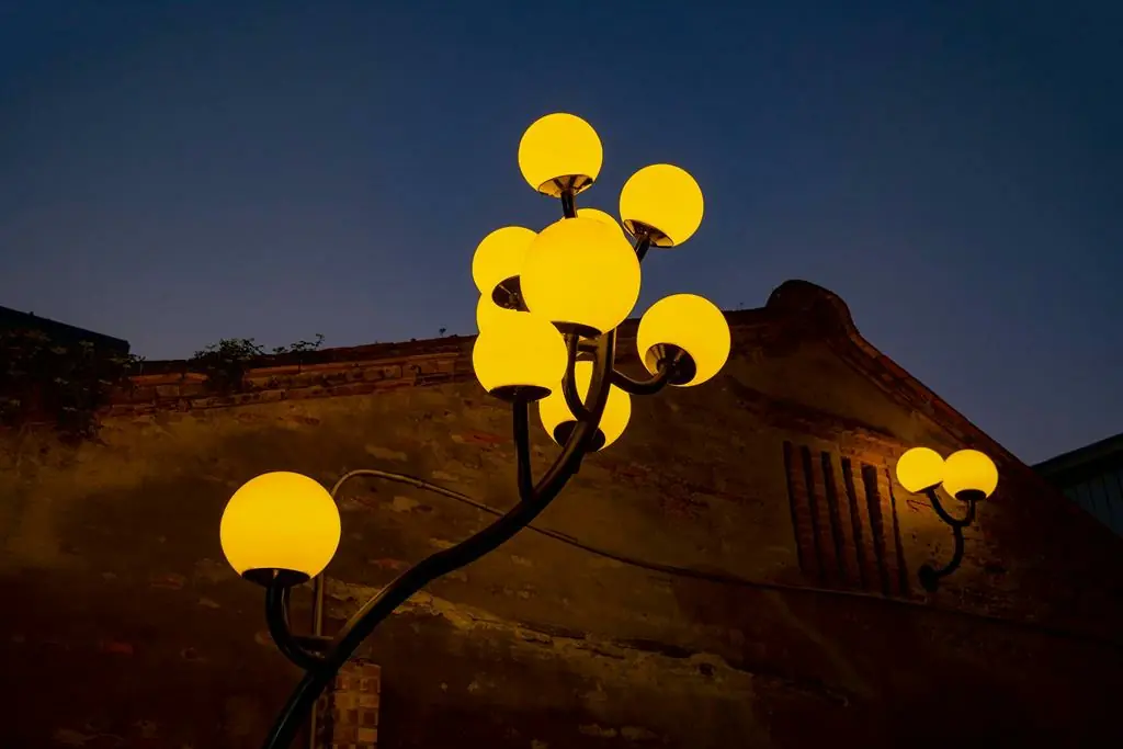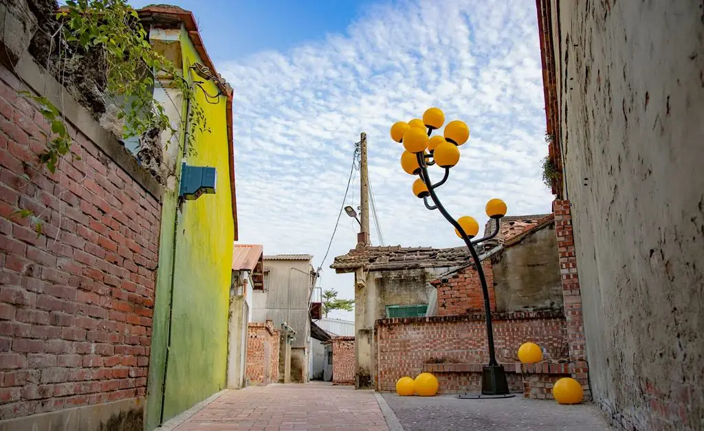 新銳藝術家石孟鑫為魚鱗巷創作的「路燈樹」以溫潤的光影照亮古老鹽水巷弄。(黃潔翻攝)