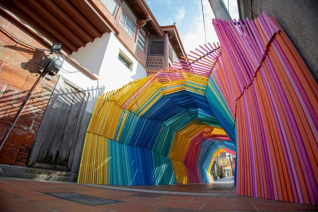 地景藝術家王振瑋以記憶的流動在連成巷構築繽紛的時光長廊。(黃潔翻攝)