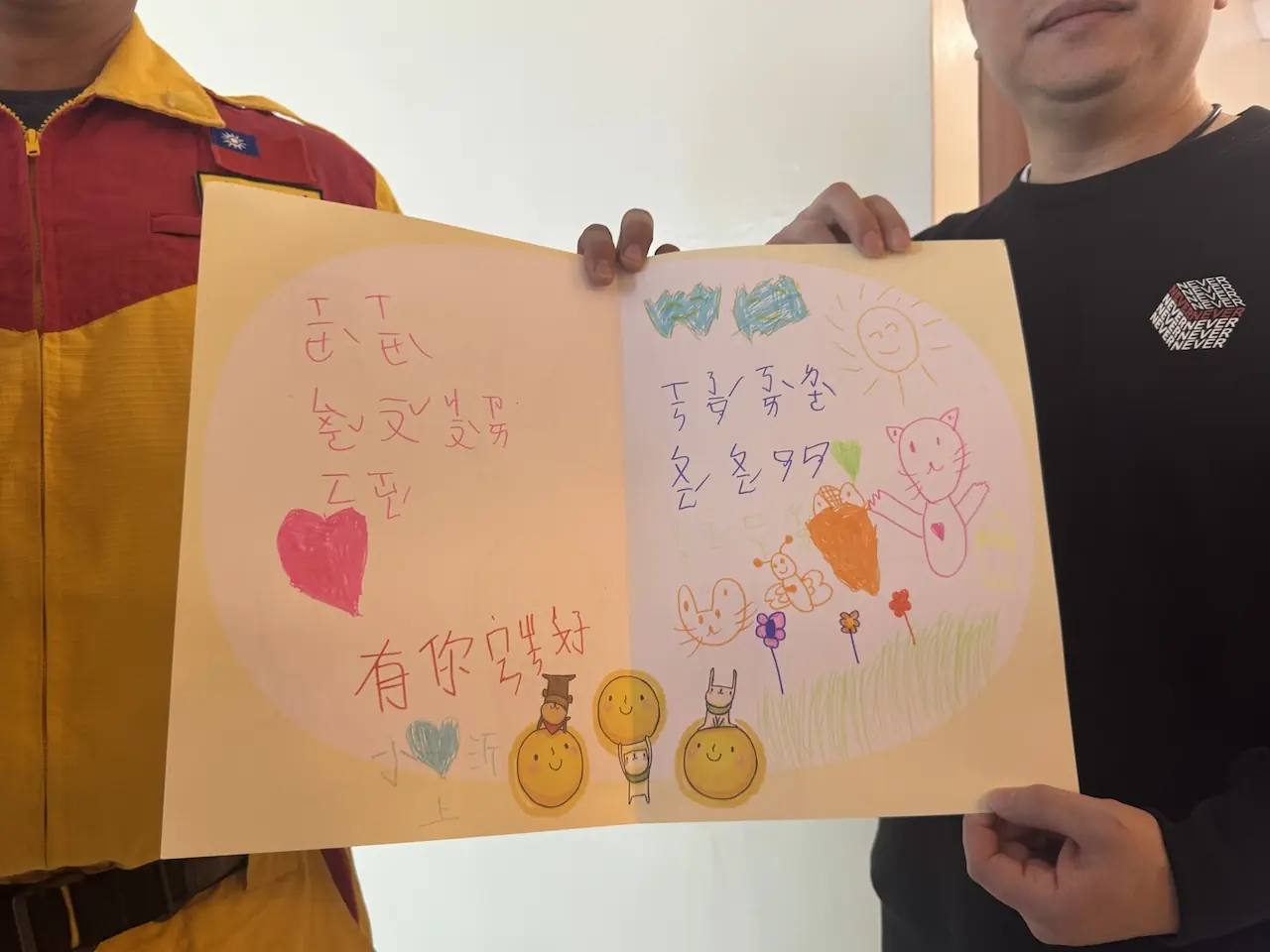 剛上小學一年級的「小沂」,在卡片上用注音符號寫著「謝謝所有救災英雄」、「新年快樂,平平安安」、「有你們真好」,特搜人員看到她很高興,把「小沂」抱起來拋上天空,活潑的「小沂」也把大隊長陳世鴻的手臂當鞦韆盪來盪去,每個人噓寒問暖,都關心「小沂」災後復原的情況,整個禮堂充滿感人、歡樂的氣氛。