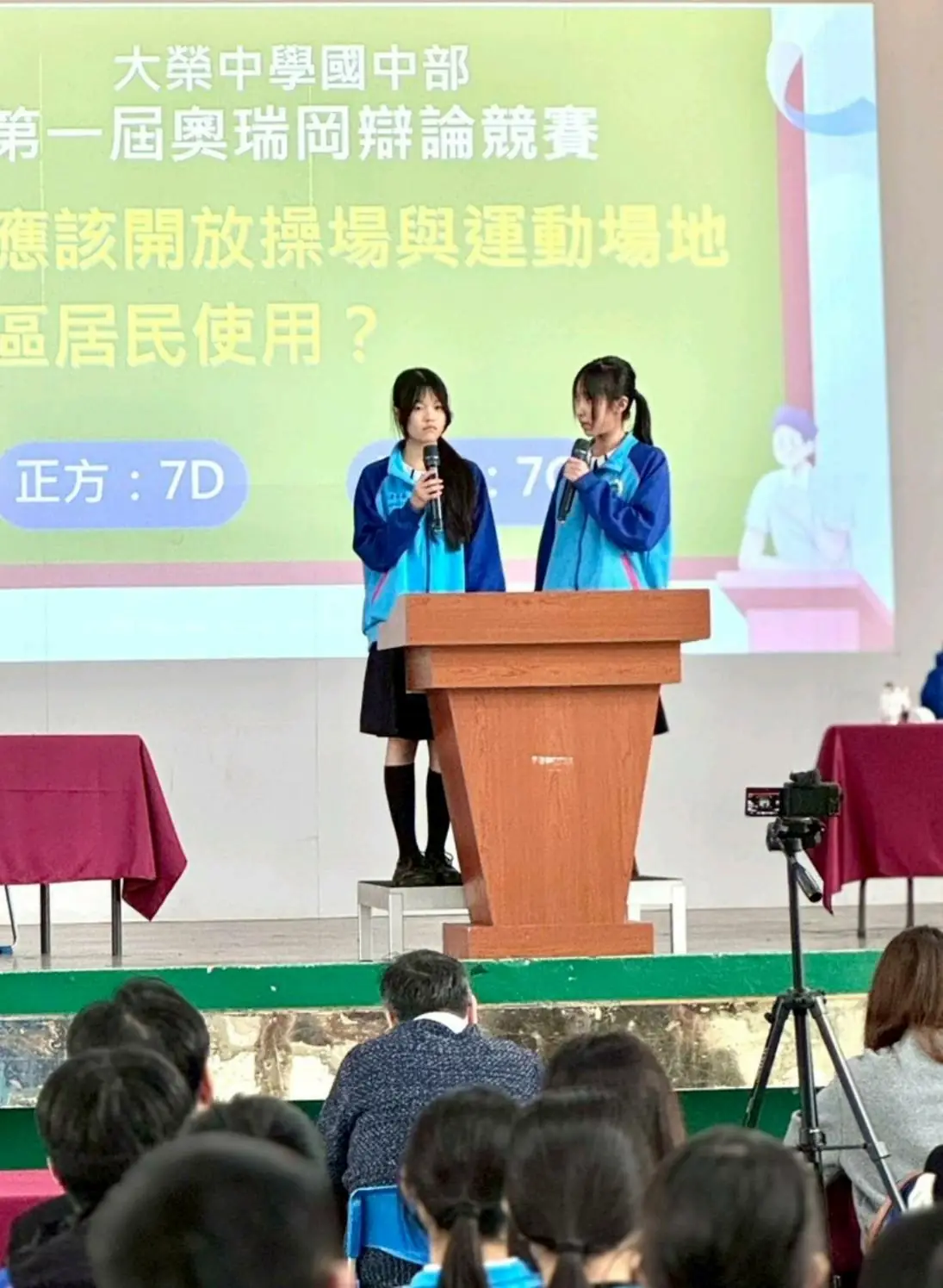 【記者陳雯萍高雄報導】高雄市大榮中學國中部1月23日下午舉辦首屆「奧瑞岡辯論比賽」成果發表會,七年級學生首度站上正式辯論舞台,圍繞校園公共議題與社會價值展開論證交鋒。兩場賽事節奏緊湊、論點清晰,展現學生優異的邏輯思考與語文表達能力,獲得師生與家長一致肯定。