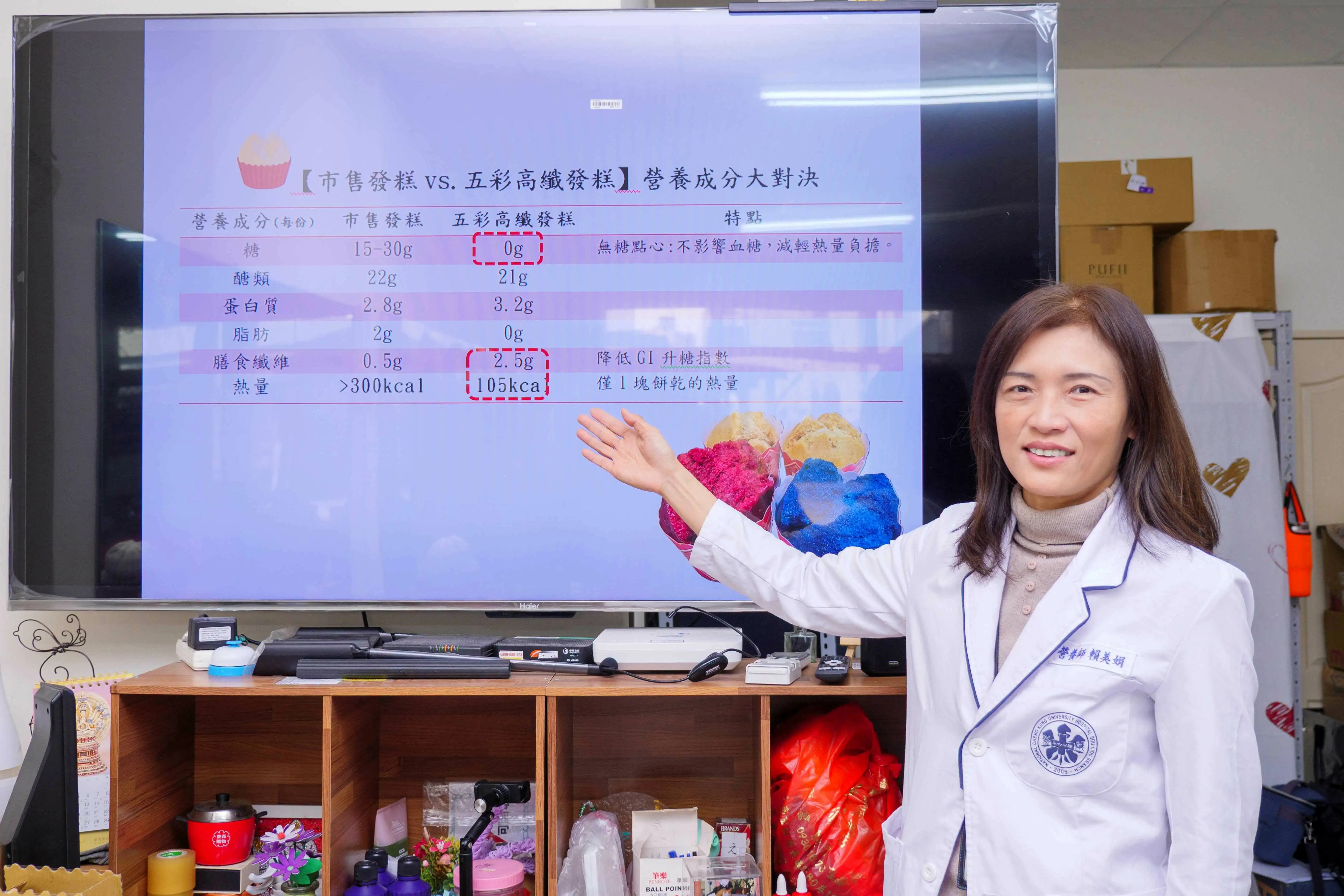 賴美娟營養師指出,農曆春節家家戶戶少不了象徵「發財」、「步步高升」的發糕,但市售傳統的發糕多由精緻澱粉製成且含糖量高,常讓重視健康的民眾卻步,她研發的「中式馬芬-五彩高纖發糕」特別適合年節期間,擔心熱量攝取過多者或是慢性病友,也適合作為平時的居家點心。