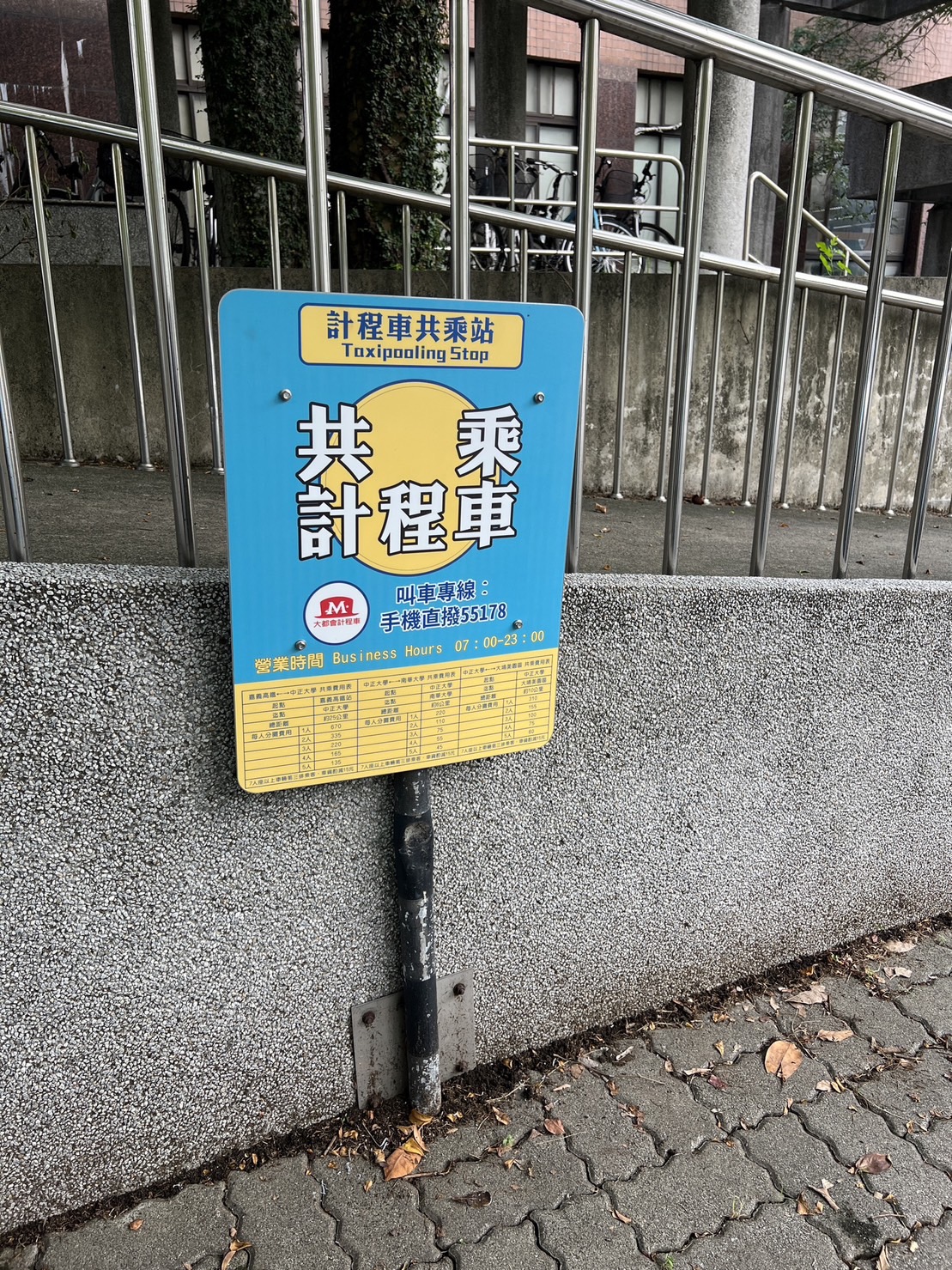 「中正大學-高鐵嘉義站」計程車共乘路線,是由大都會平台科技(股)公司嘉義分公司營運服務,起迄端均設置專屬站牌,分別位於高鐵嘉義站2號出口前方iRent停車場、中正大學活動中心右側、南華大學公車候車亭、大埔美精密機械園區服務中心旁第一停車場前。車身有識別Logo及專人引導,共乘路程約25公里,車資以嘉義縣計程車費率為基礎,按乘客人數計算分攤原則,以5人搭乘為例每人車資只要135元,共乘又共享車資,除節能減碳又可省荷包。