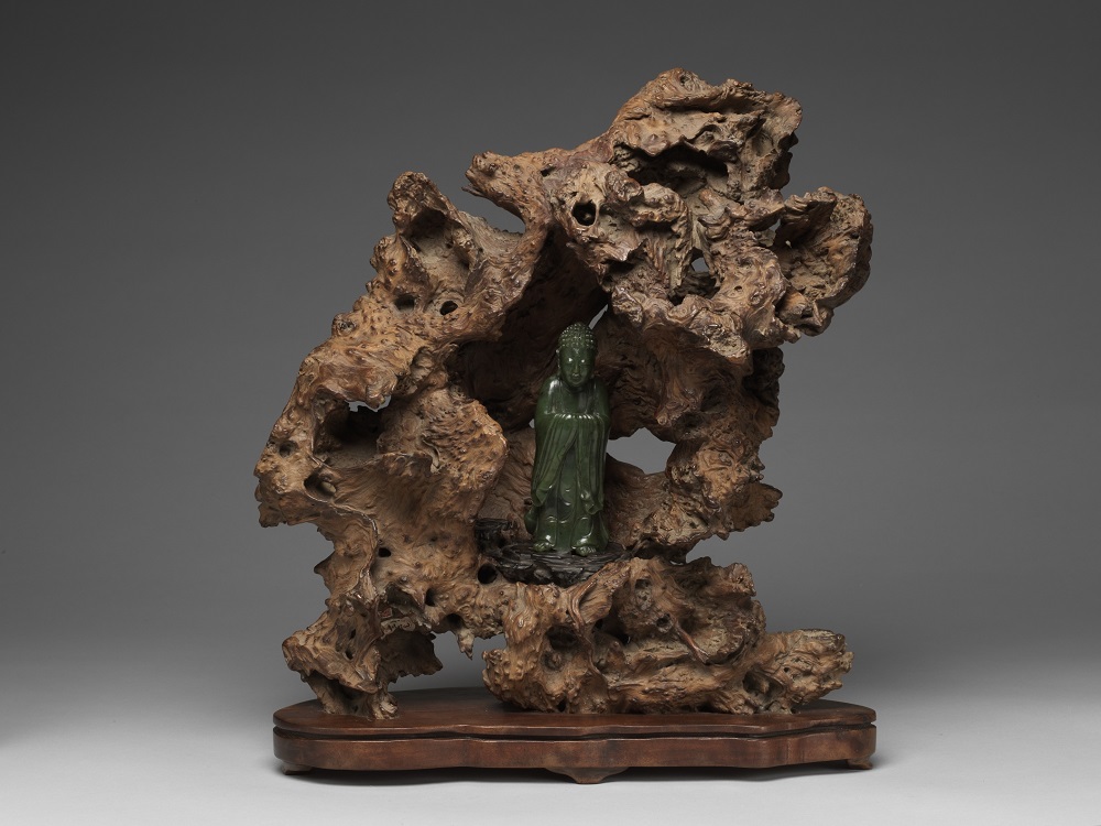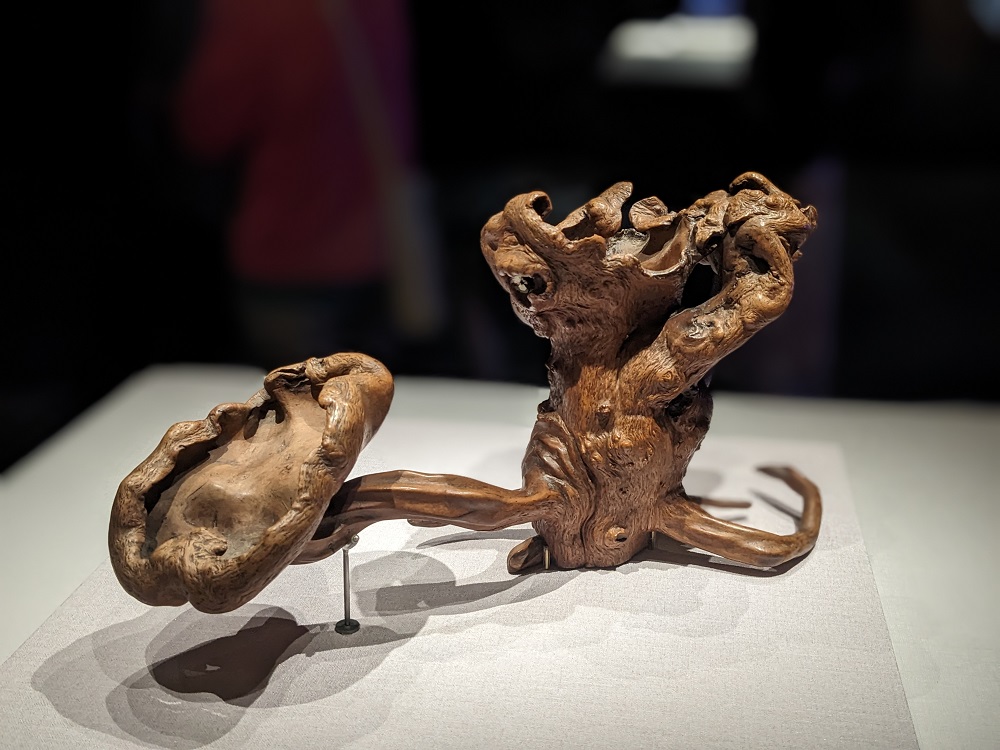 陳玉秀指出,長相糾結詭異的樹根、樹瘤(癭)作品堪稱「病態美」的藝術創作,明代之後,奇木造型的文房用品、家具陳設大量出現,收藏鑑賞此類作品也成為文人間往來的話題。本次展出的「癭木靈芝筆筒」由天然樹根磐磨而成,主幹布滿大小癭結,副枝末端結有橢圓形狀的「靈芝」,筆筒底部刻有「絳雲樓珍藏」,絳雲樓是明萬曆年間探花郎錢謙益與當時江南才女妻子柳如是的藏書樓,這件筆筒曾是他們共同擁有。