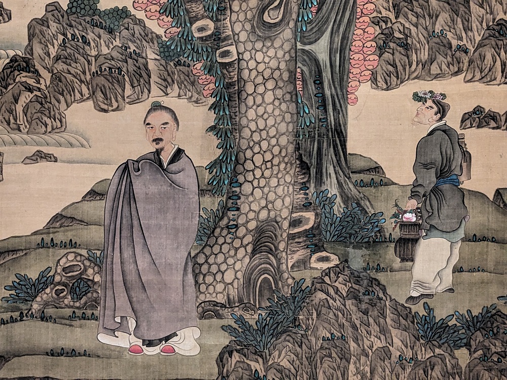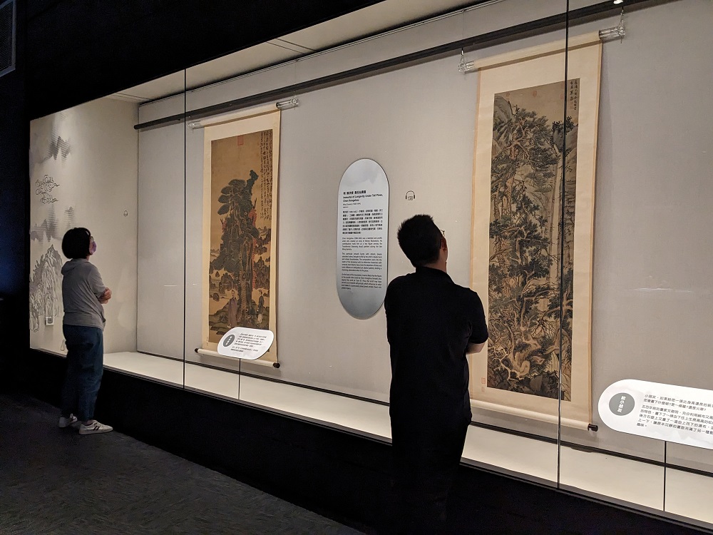 林宛儒表示,松樹、柏樹獨特的樹幹紋理及長青寓意,常成為畫家喜愛描繪的對象,而畫家們觀察樹木、逐漸變形的抽象化詮釋,則讓畫作充滿熟悉又清新的趣味。〈古木寒泉〉繪於一五四九年,是文徵明八十歲的極精之作,近景樹幹糾結扭曲或參雲直上,加上後方高聳石壁迫近,使畫面幾無留白;〈喬松仙壽圖〉造型構圖奇絕,人物相貌怪異,其中紫袍人物可能就是署名「蓮子」的陳洪綬,本幅因具自畫像性質而彌足珍貴。
