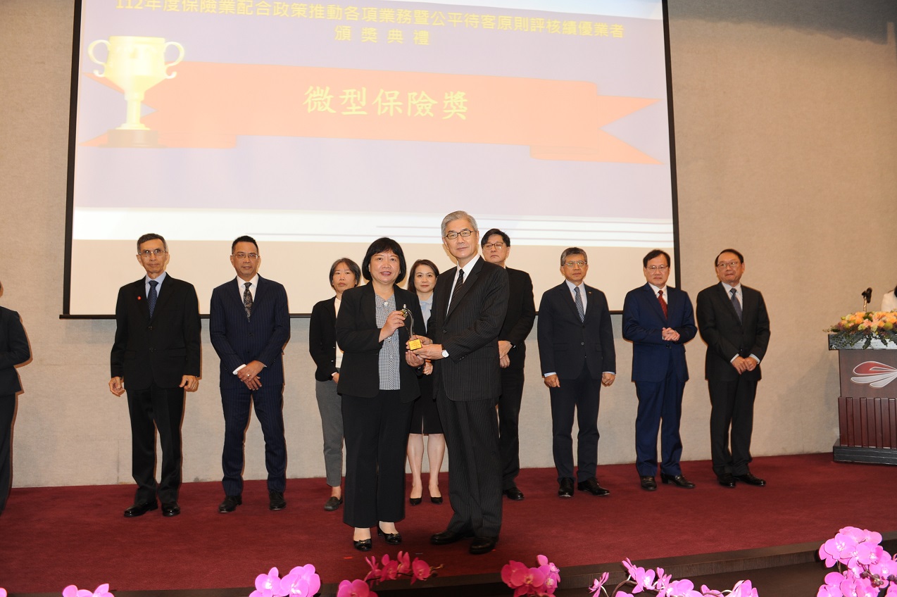 金融監督管理委員會於11月17日舉行「112年度保險業配合政策推動各項業務暨公平待客原則評核績優業者頒獎典禮」,中華郵政公司連續第3年獲頒微型保險競賽「業務績優獎」、「身心障礙關懷獎」及小額終老保險競賽「友善高齡獎」等3項殊榮,並由壽險處長簡詠涵及副處長楊麗芬代表領獎。