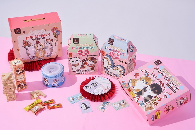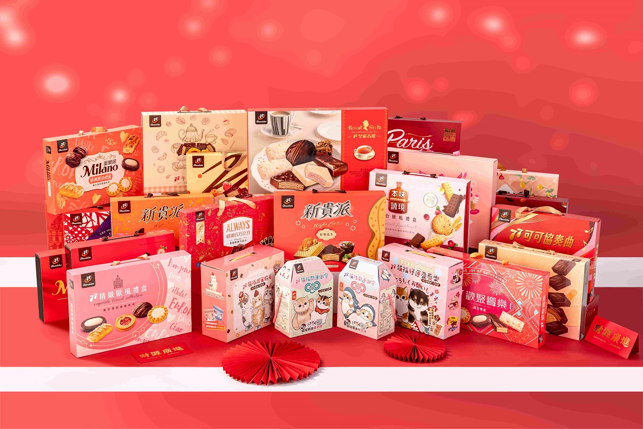 宏亞食品在經典巧克力與餅乾的研製創新上,精準掌握在地大眾的味蕾喜好,今年更攜手日本超療癒的「貓福珊迪 mofusand」共三款限定主題禮盒,可愛貓咪插畫搭配收納包、撲克牌、疊疊樂各別限定好禮;77也將品牌經典的新貴派、巧菲斯、蜜蘭諾組成77皇家春禧禮盒,六款不同風味讓全家大小可以一盒享用到豐富多樣經典餅乾;77推出多達22款禮盒提供年節送禮,要讓龍年送出滿滿的心意。