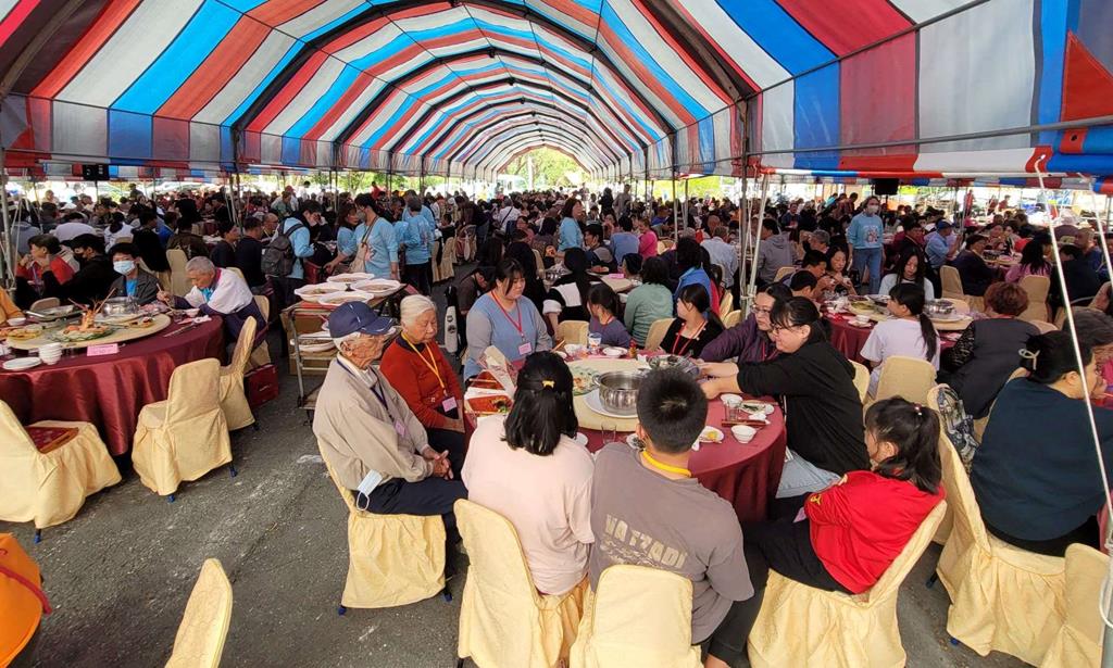 【記者黃潔台南報導】歲末送玉兔迎金龍,新冠疫情期間停辦的「佛祖請吃飯 扶弱濟貧」關懷弱勢寒冬送暖圍爐活動今年重新恢復舉辦,3日中午在臺南市左鎮噶瑪噶居寺入口戶外停車場席開百桌,除邀請街友也擴大納入左鎮、玉井、楠西、南化區等偏遠山區低收入戶家庭與弱勢邊緣戶、腦性麻痺、脊髓損傷、聽、語障等身心障礙弱勢者及陪同照顧人員等約1000人參與,連結各界慈悲與善心,為臺南地區弱勢族群帶來溫暖身心饗宴。