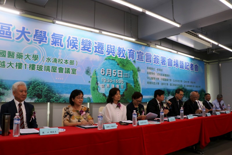 2024「中區大學氣候變遷與教育宣言」簽署儀式於6月5日下午在中國醫藥大學水湳校區卓越大樓1F玻璃屋會議室舉行,聯合簽署的10所大學代表有:中山醫學大學何永全副校長、中國醫藥大學洪明奇校長、弘光科技大學黃月桂校長、亞洲大學吳聰能副校長、東海大學劉正副校長、南開科技大學梁瑛心副校長、逢甲大學周至宏榮譽副校長、國立勤益科技大學李鴻濤副校長、國立暨南國際大學武東星校長、靜宜大學林思伶校長。