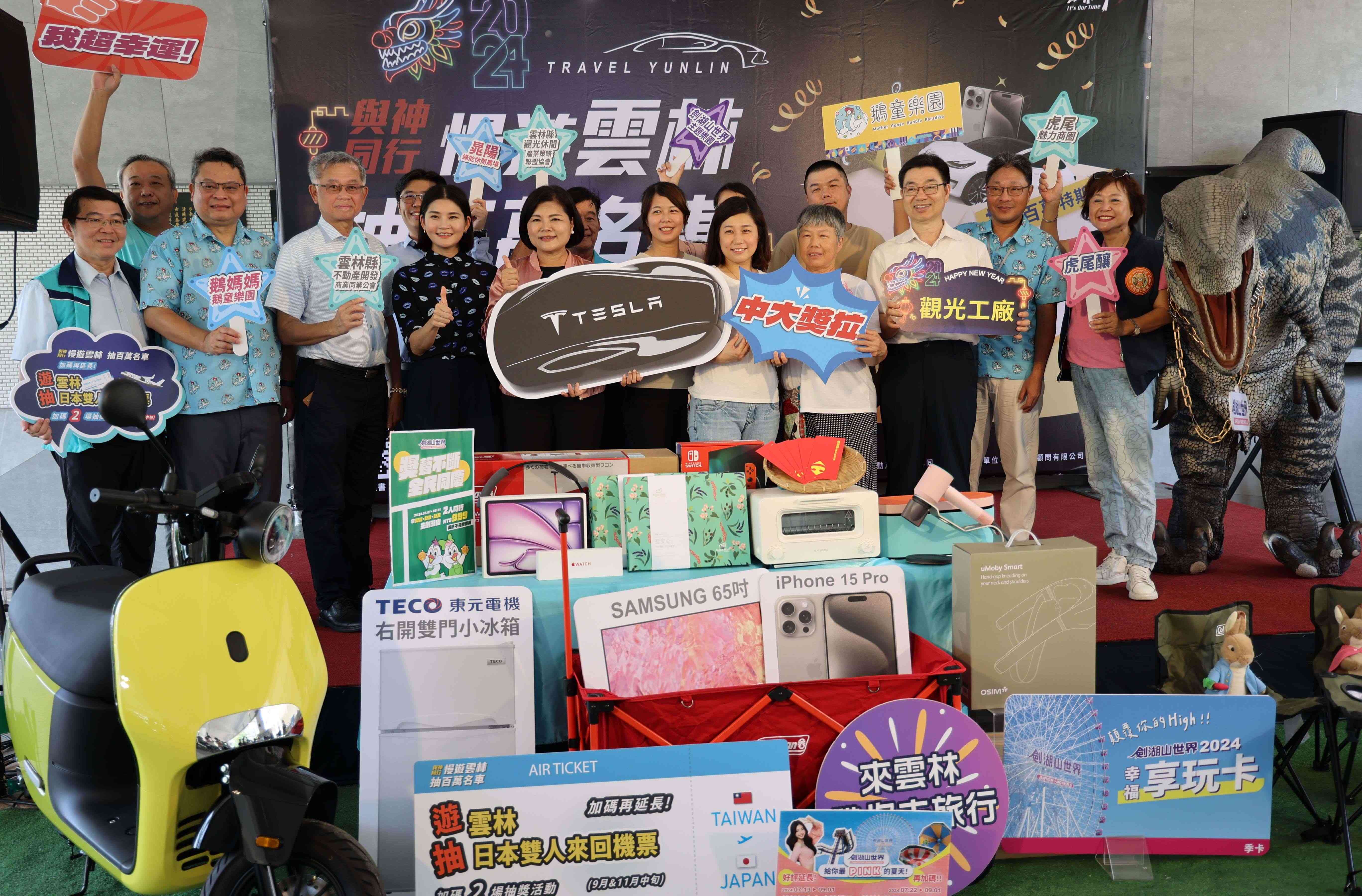 張麗善表示,縣府也推出系列精彩暑期活動不斷電,而「2024與神同行遊雲林抽百萬名車」也延長加碼,同時9月和11月各有一場加碼獎項抽獎,11月更將抽出日本(不限區域)來回機票等大獎,鼓勵全國民眾多來雲林觀光住宿購物,更要來雲林觀看雙十國慶煙火,消費發票記得登錄平台參加抽獎,每個人都有機會抽中大獎。