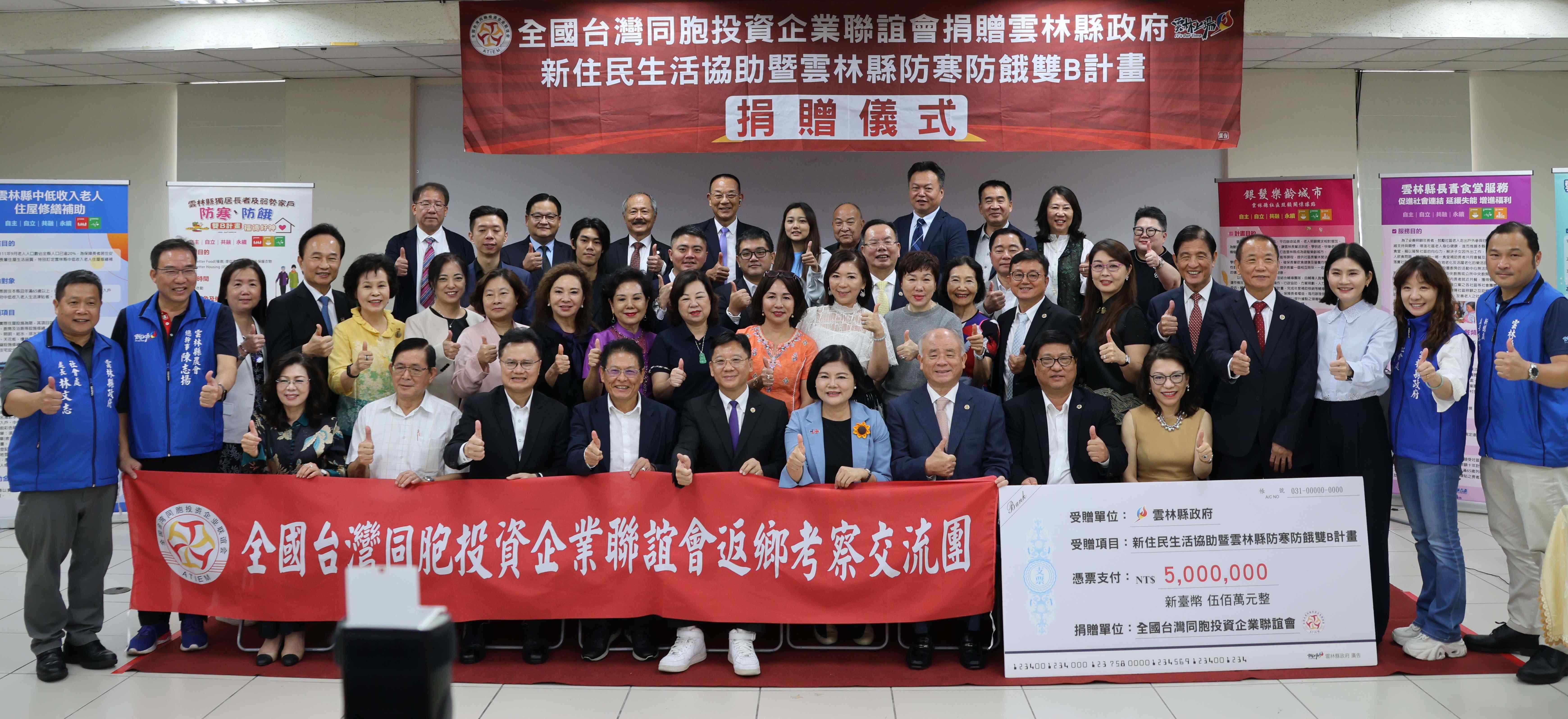 全國台灣同胞投資企業聯誼會長李政宏及監事長黃明智,今天上午率幹部一行42人至雲林縣參訪,並以實際行動捐助縣府500萬元支持「新住民生活協助暨獨居長者及弱勢家戶防寒、防餓雙B服務計畫」,期盼民間企業與團體捐款善舉能拋磚引玉,將這股溫暖社會的能量擴散至更多面向,增添安定的力量。