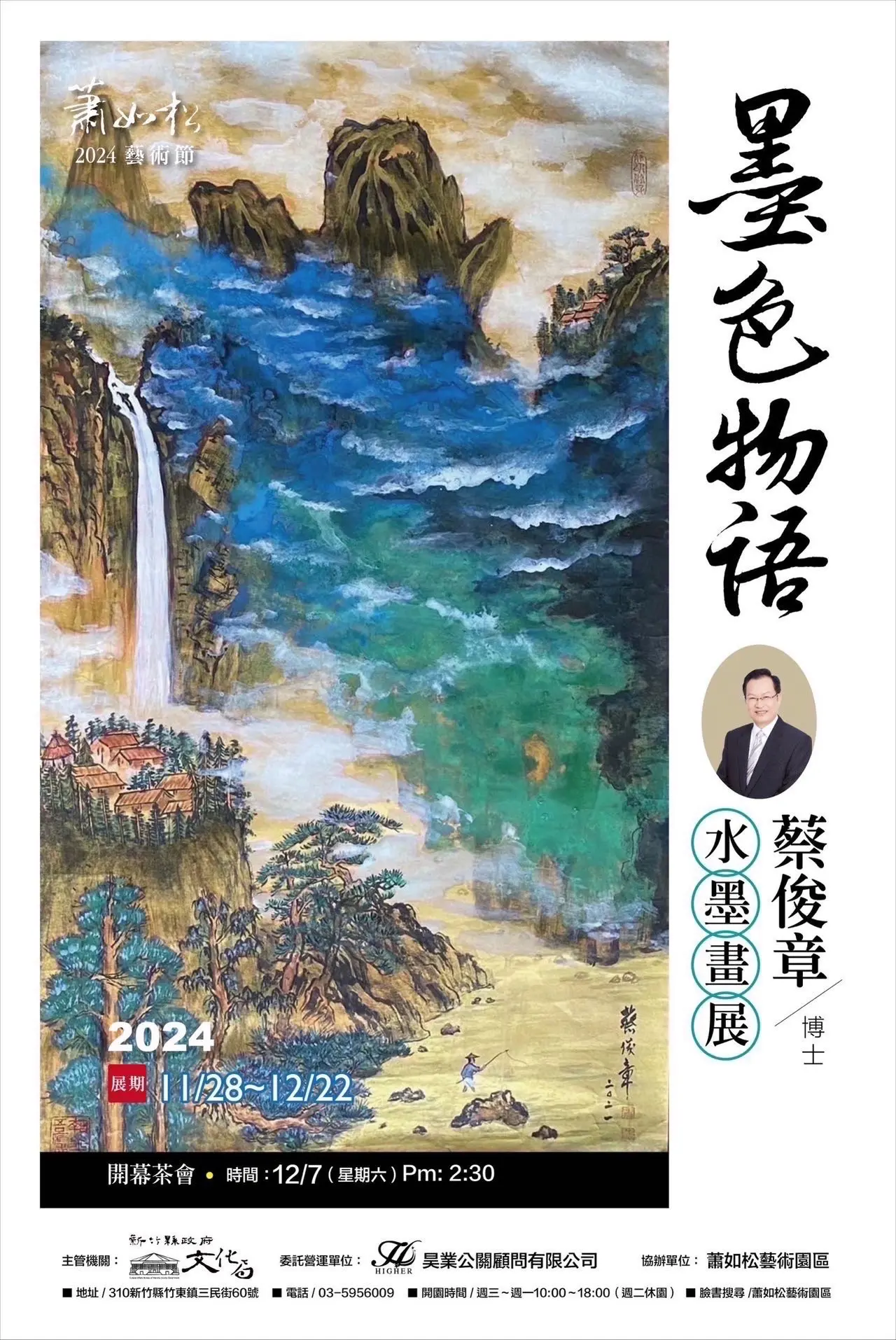 人稱「警界儒將」的前台灣警政署副署長蔡俊章博士,也是國際知名水墨畫家、星雲大師全集插畫作者;習畫近一甲子,此次再度至蕭如松藝術園區展出「墨色物語」水墨畫展,以大千居士之潑墨潑彩技法所作山水畫及甲辰龍年畫龍為主,再佐以人物、其他獸類畫作為輔,有其特色。