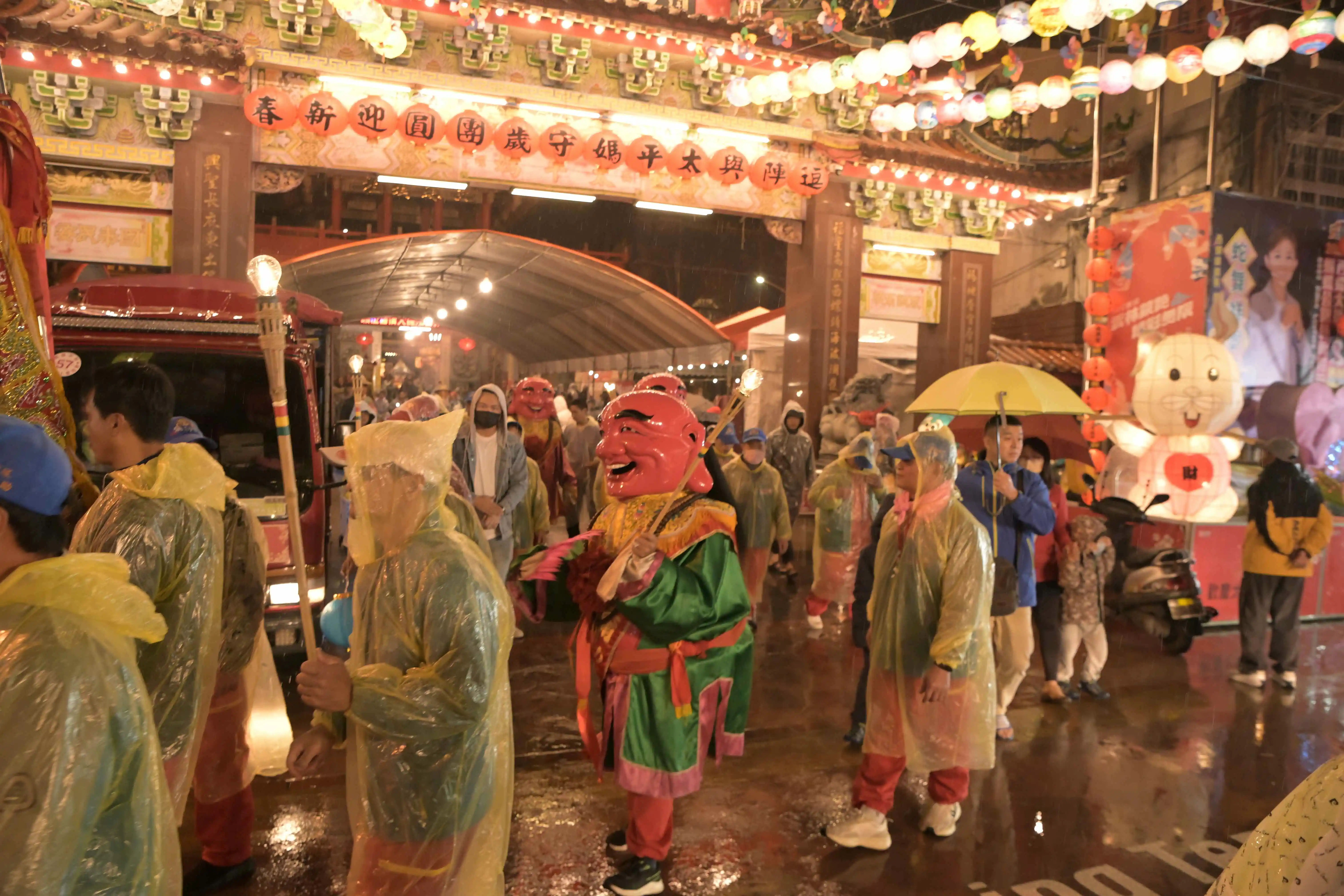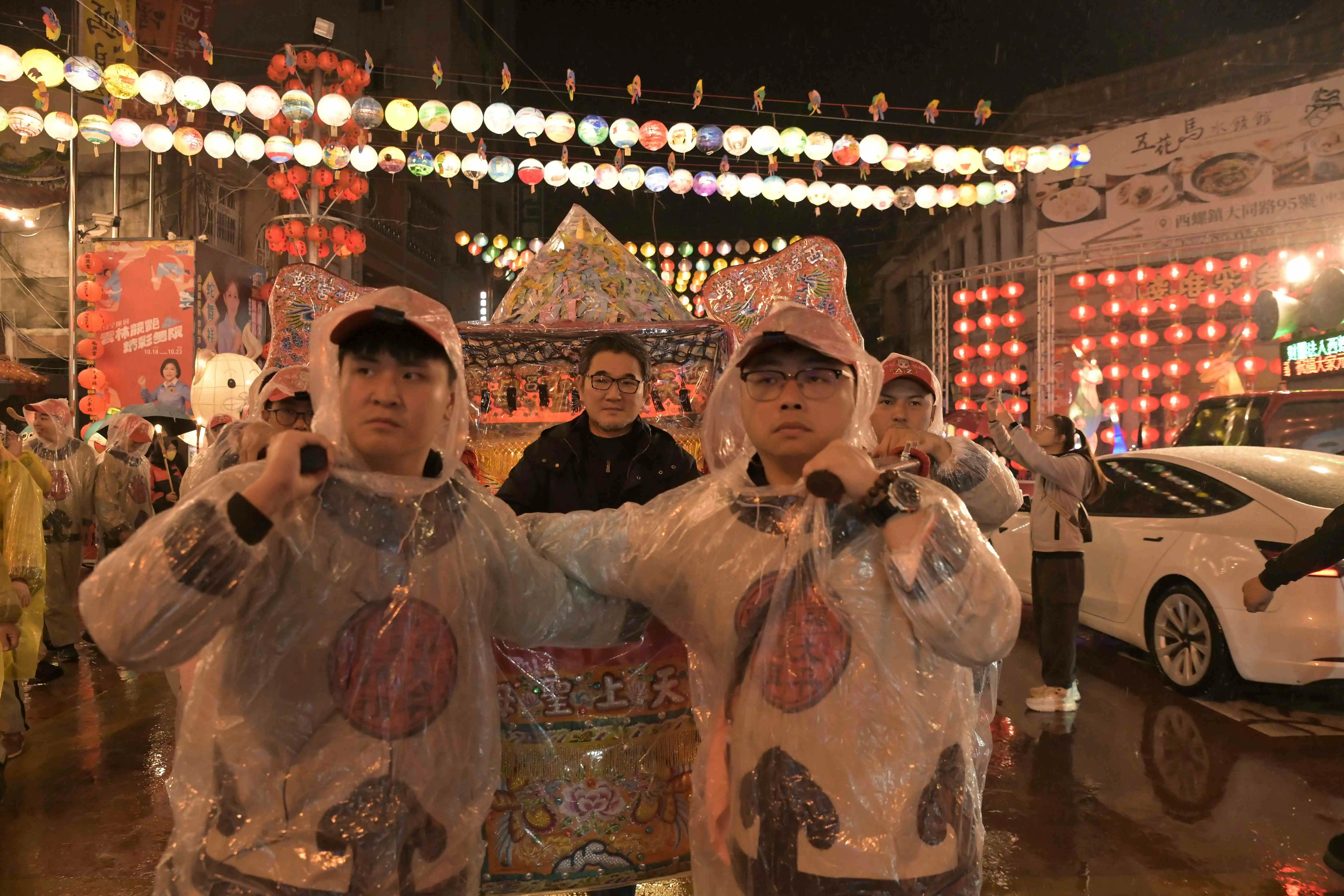 【記者黃金郎雲林報導】雲林縣西螺鎮福興宮昨(十二)日晚間辦理元宵節踩街活動,儘管天公不作美下著雨卻澆不熄民眾的熱情,近千名民眾穿著雨衣、提著特製「金芒燈籠」跟著「太平媽」駕前隊伍逛迎春燈會燈廊,氣氛熱絡。