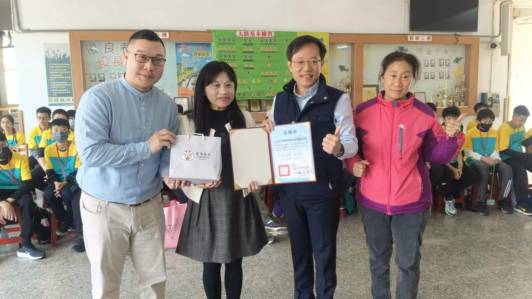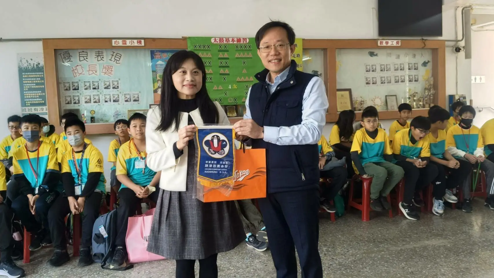 而文祥國小學生也準備了滿滿的心意回贈旗津國小,他們親手製作的木工作品與環保蚊香,象徵著雙方情誼的交流與祝福。旗津國小校長李亞傑則回贈錦旗與120週年校慶紀念品,這場相遇雖短暫,卻在彼此心中留下深刻的印記。
