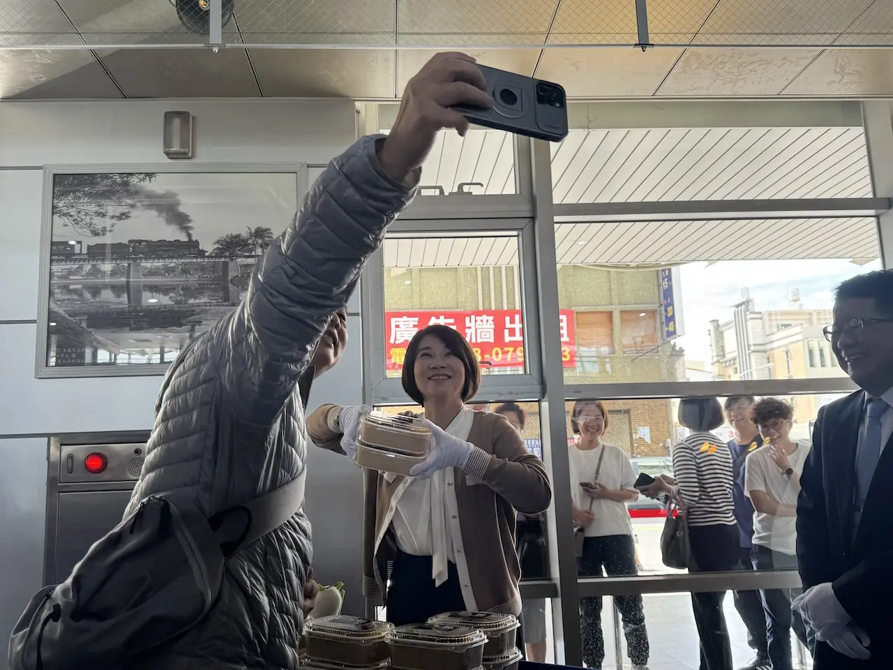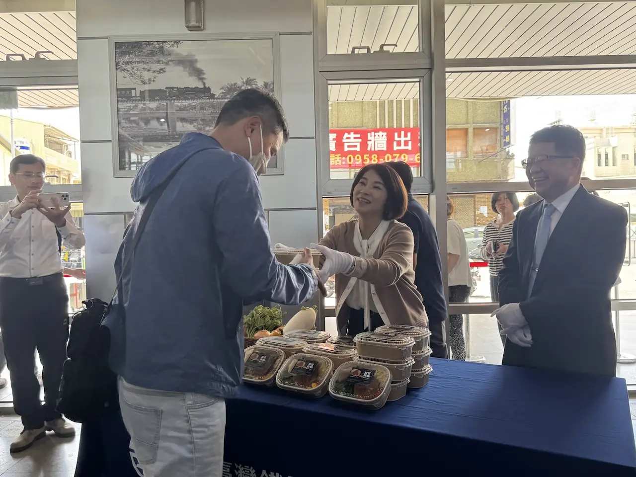 周春米和陳文川並當起「一日店長」在火車站販售「龍虎好屏便當」,吸引不少遊客排隊購買。