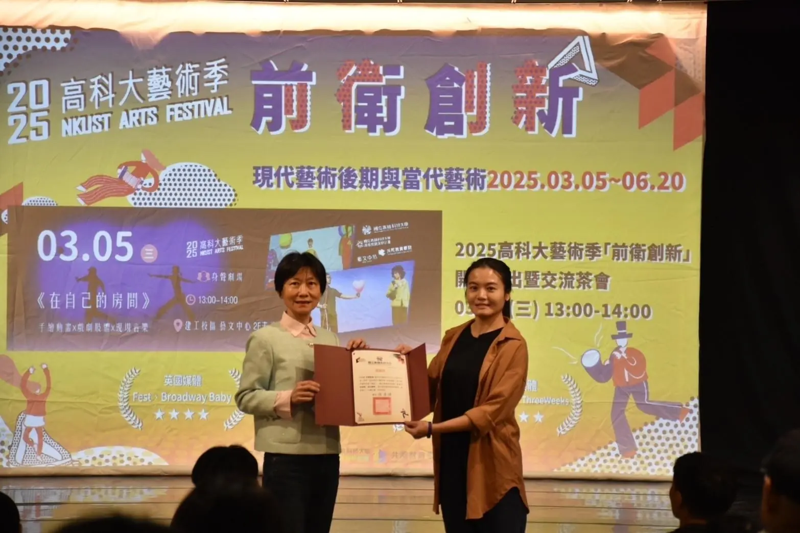 圖/高科大共教院長楊碧藍(左)特別致贈感謝狀予身聲劇場團長莊惠勻,感謝劇團帶來精采演出。(高科大提供)
