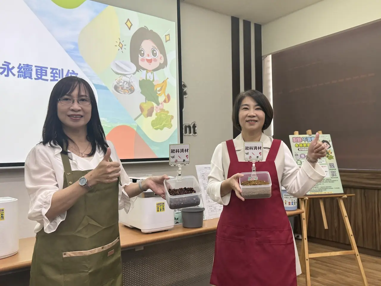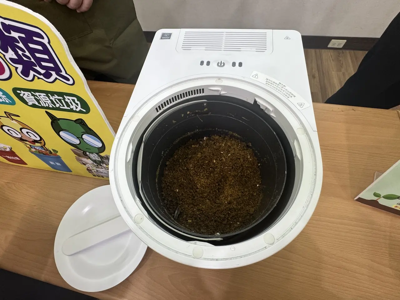 透過廚餘機可把廚餘製做成有機肥。(記者梁秀瓊拍攝)