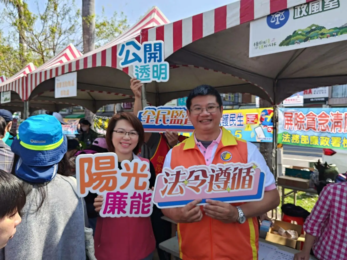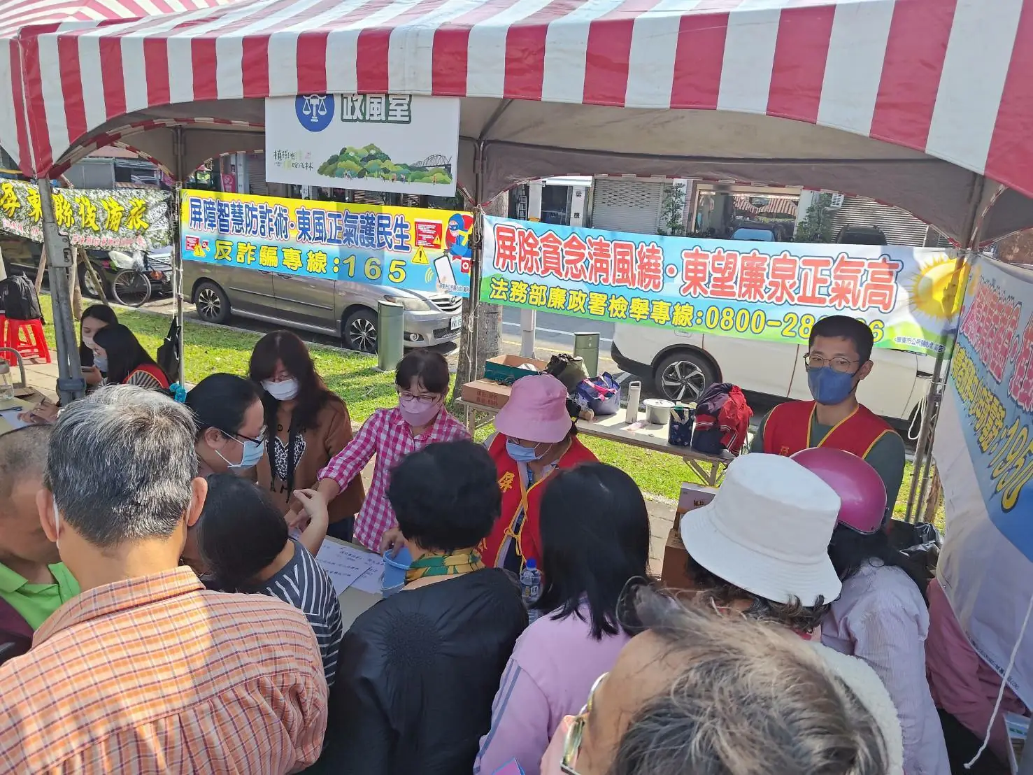 圖:屏東市公所政風室於千禧公園政令宣導攤位,宣導「公務員廉政倫理規範」、「公職人員利益衝突迴避法」、「反詐騙」以及「廉政透明晶質獎」等重要主題。(屏東市公所)