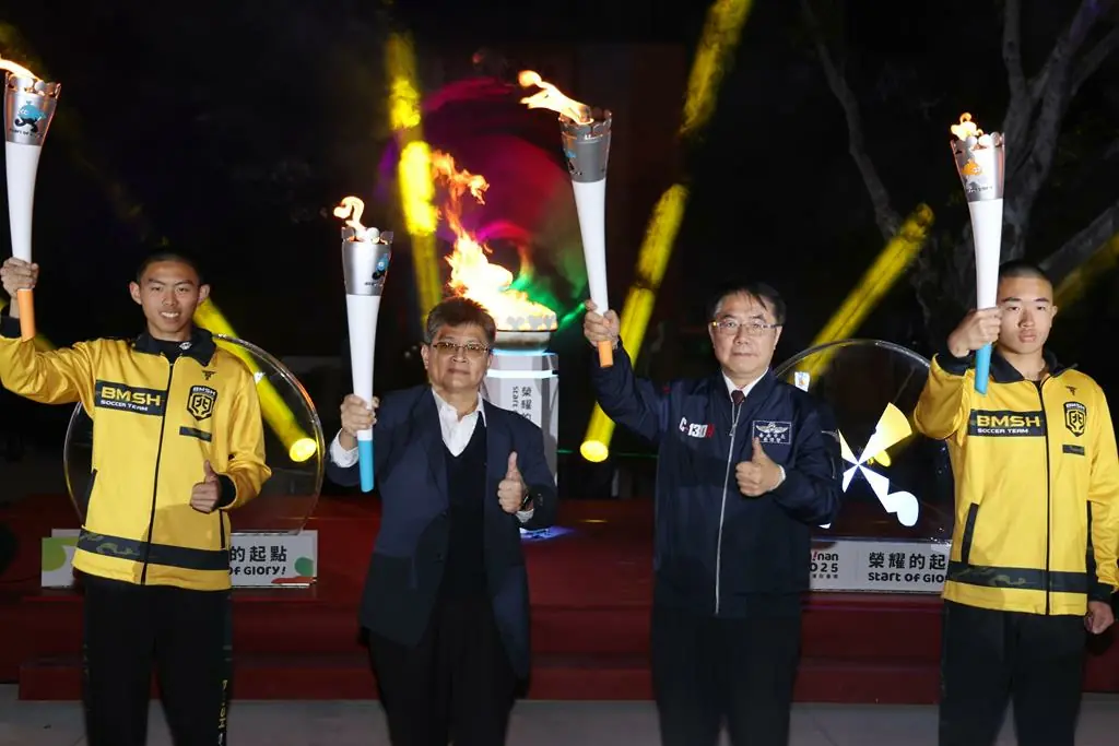 聖火引燃儀式由十鼓擊樂團的磅礡表演開場,迎接北門高中聖火隊以及114年全中運吉祥物大員和甜甜進場,教育部體育署副署長房瑞文與南市長黃偉哲共同引燃火炬並交棒予聖火隊,宣告114年全中運聖火傳遞正式啟動。