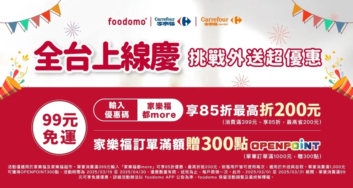 業者表示,foodomo與家樂福聯手祭出多項優惠,讓你在家也能輕鬆享受超值外送服務;四天的清明連假即將到來,想要出外野餐、露營,或是和家人朋友在家聚會,都可以透過foodomo外送平台選購家樂福零食、飲品、生鮮食材等多樣商品,一鍵下單,外送到府。即日起至3月31日,家樂福單筆外送訂單消費滿99元,foodomo會員即可享有免運優惠;此外,即日起至4月30日,單筆訂單消費滿399元並輸入優惠碼【家樂福都 more】,即可享有85折優惠,最高折抵200元。