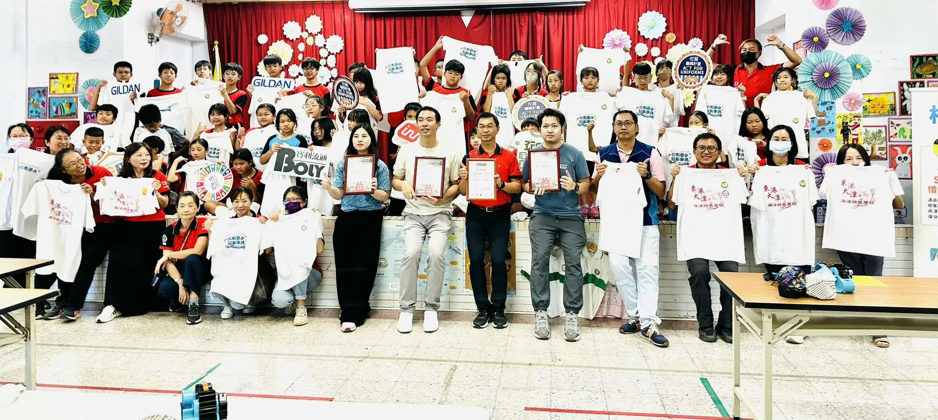 【記者廖銘瑞/屏東報導】 屏東縣東港鎮大潭國小連續三年師生於校內進行世界地球日宣導,今年特地為了能夠深化環境教育與創意學習的實踐力,與公營及民間團體如:海洋委員會海保署屏東保育站、社團法人成衣印花文創協會、T恤手造館、CC訂製、威齊織品有限公司、寶利流通事業有限公司等攜手合作,並由大潭國小海洋教育創客中心參與策劃「校服翻轉計畫」,於4月22日這天舉辦一場結合環保創作、海洋教育與印花體驗的「SDGs惜服體驗」活動。