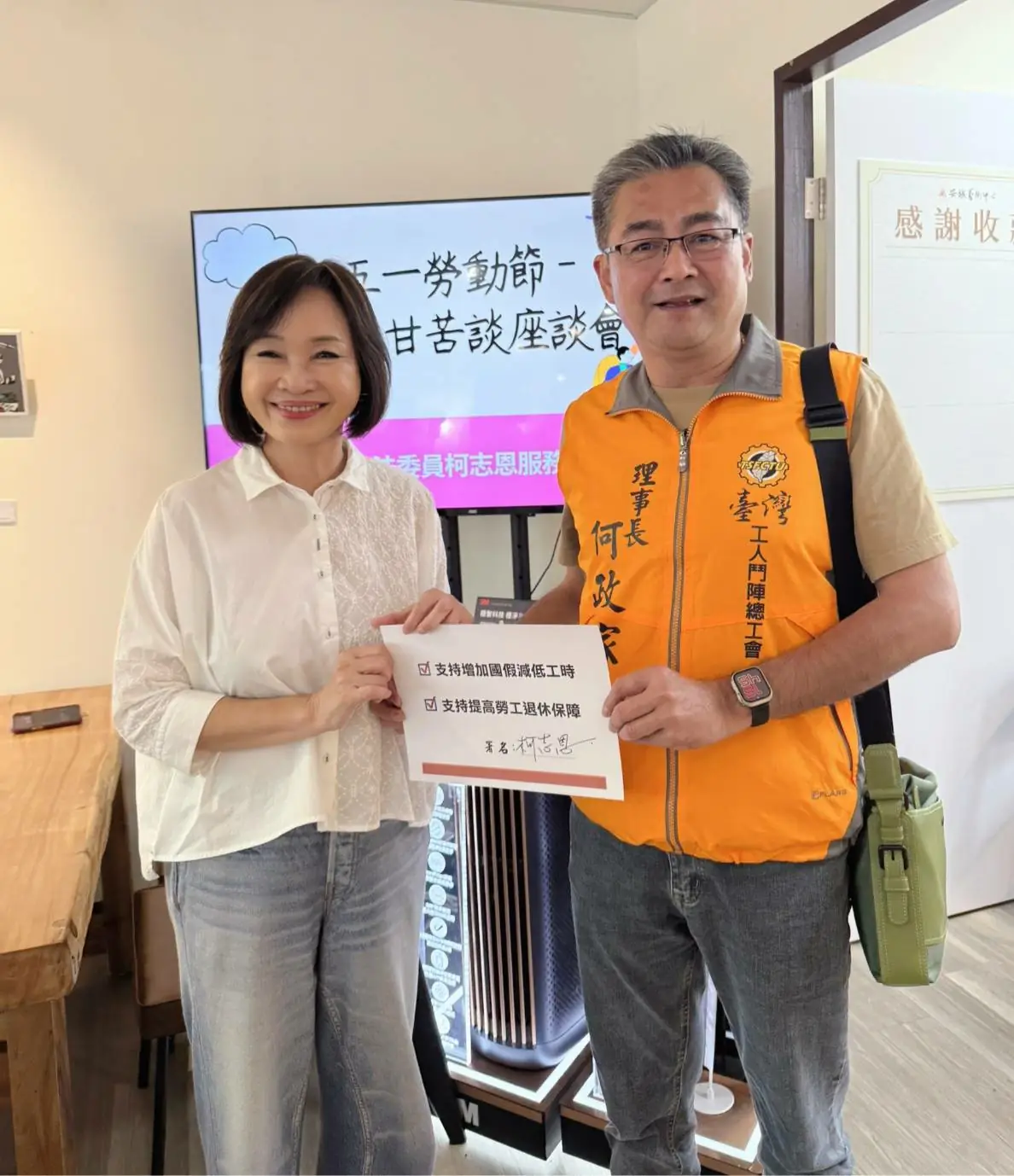 新高市產業總工會理事長何政家率先發言,指出台灣勞工工時不降反升,薪資偏低導致被迫加班,並直指台灣人均GDP恐被日本反超。他呼籲增加國定假日、減少工時、強化勞工退休保障,並當場向柯志恩提出具體訴求,獲得柯志恩親自簽名支持,展現對勞工政策的高度重視。