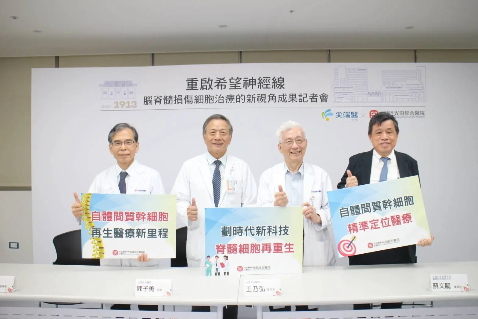 【記者許進輝綜合報導】光田綜合醫院日前於台中沙鹿向上院區舉辦「脊髓損傷細胞治療發表會」,對外發表幹細胞應用於脊髓及腦損傷治療的臨床成果;發表會現場由光田綜合醫院王乃弘總院長、向上院區陳子勇院長、張家築副院長,以及台灣尖端先進生技醫藥股份有限公司(尖端醫)蘇文龍董事長等人出席。