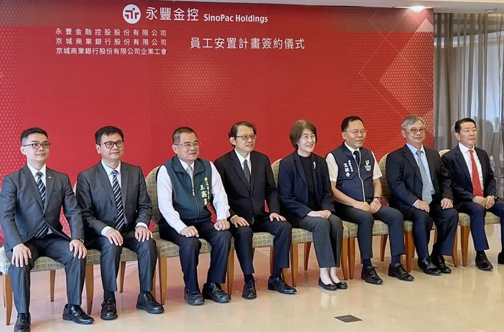 【記者黃潔台南報導】京城商銀企業工會與永豐金控,以及京城商銀等三方的勞資雙方,9日就協商完成的「員工安置計畫」進行簽約儀式;勞動部勞動關係司長王厚偉、臺北市政府勞動局長王秋冬、臺南市政府勞工局長王鑫基、永豐金控董事長陳思寬、京城銀行工會理事長葉寒柏,以及京城商銀總經理姜宏亮等均出席見證。
