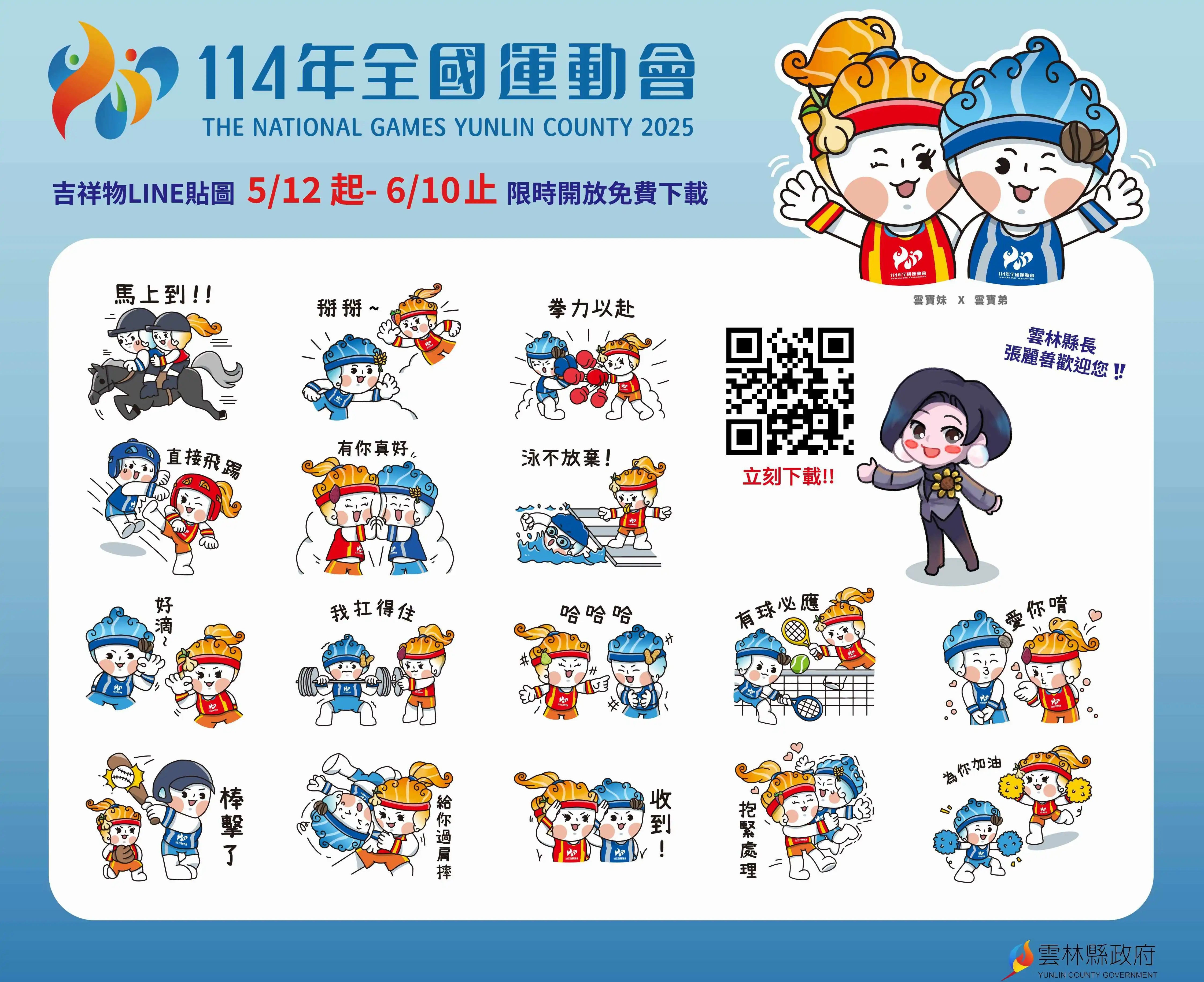 114年全國運動會搶先推出16個運動圖標LINE貼圖,即日起於Facebook、Instagram及LINE三處上架,LINE貼圖以「雲」的意向為主體,結合全運會運動項目及吉祥物「雲寶弟」、「雲寶妹」做為設計元素,呈現各競技好手們齊聚雲林,在賽場上精彩綻放,盡情揮灑神采無限,不論輸贏都以運動家精神全力以赴。